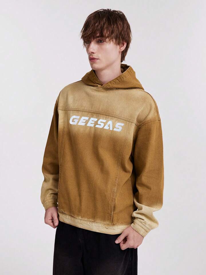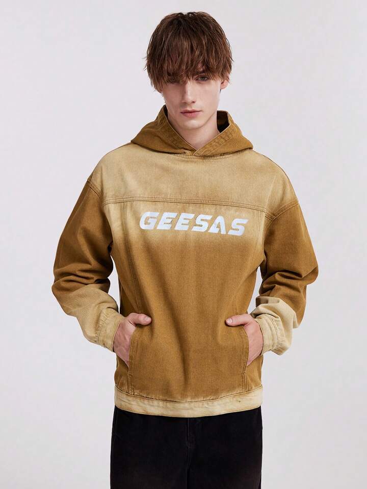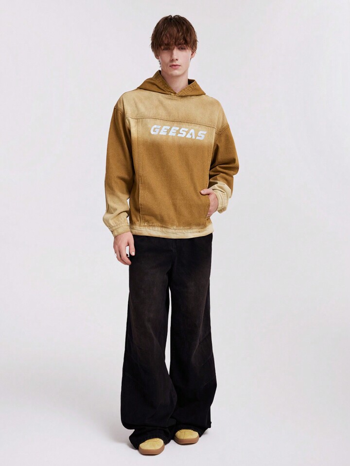Prep جاكيت جينز بغطاء رأس مطبوع بأحرف مُتدرجة اللون للرجال