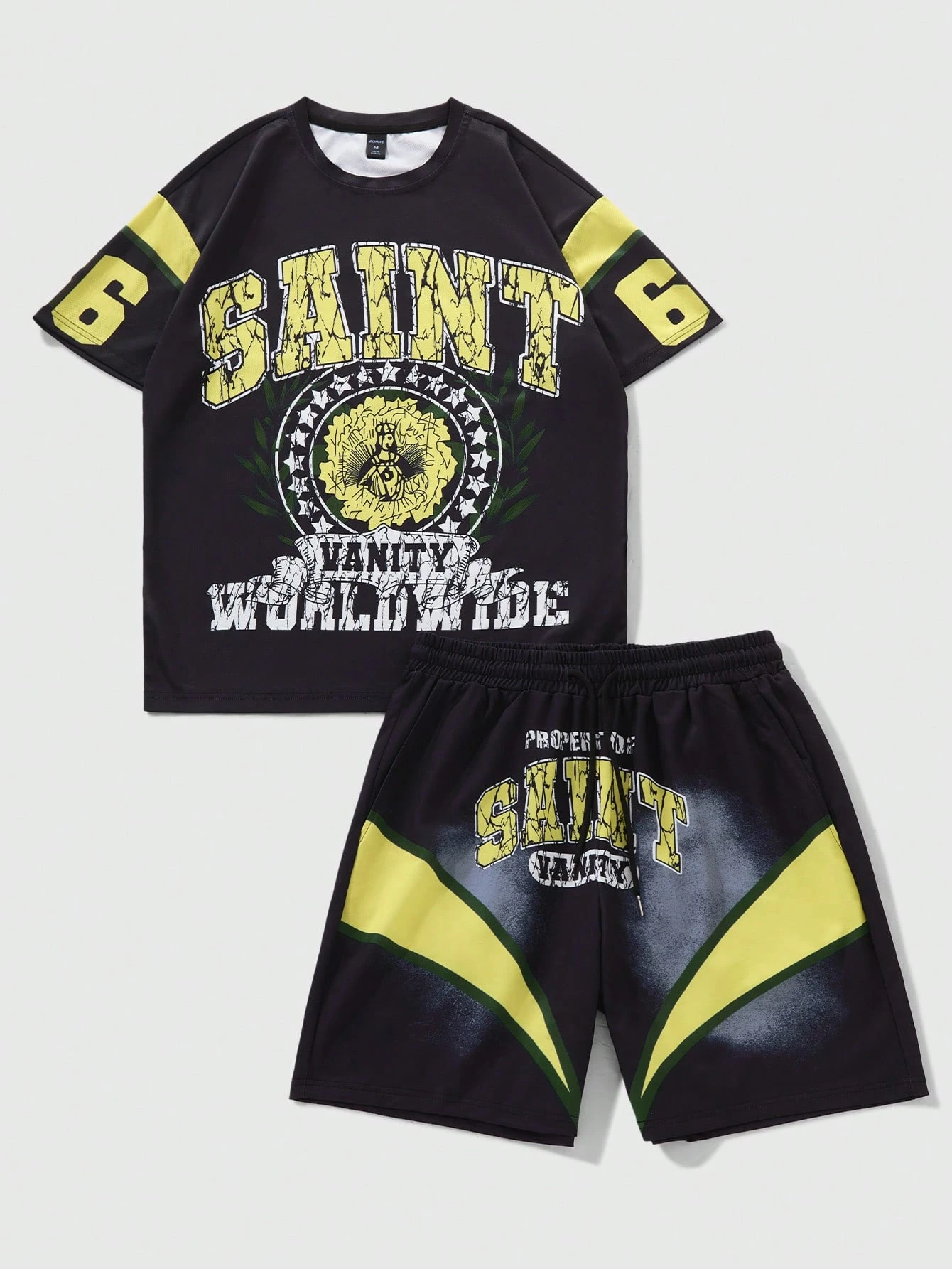 Prep مجموعة تي شيرت قصير الأكمام وشورت مطبوع برسائل للرجال الكاجوال