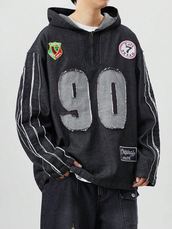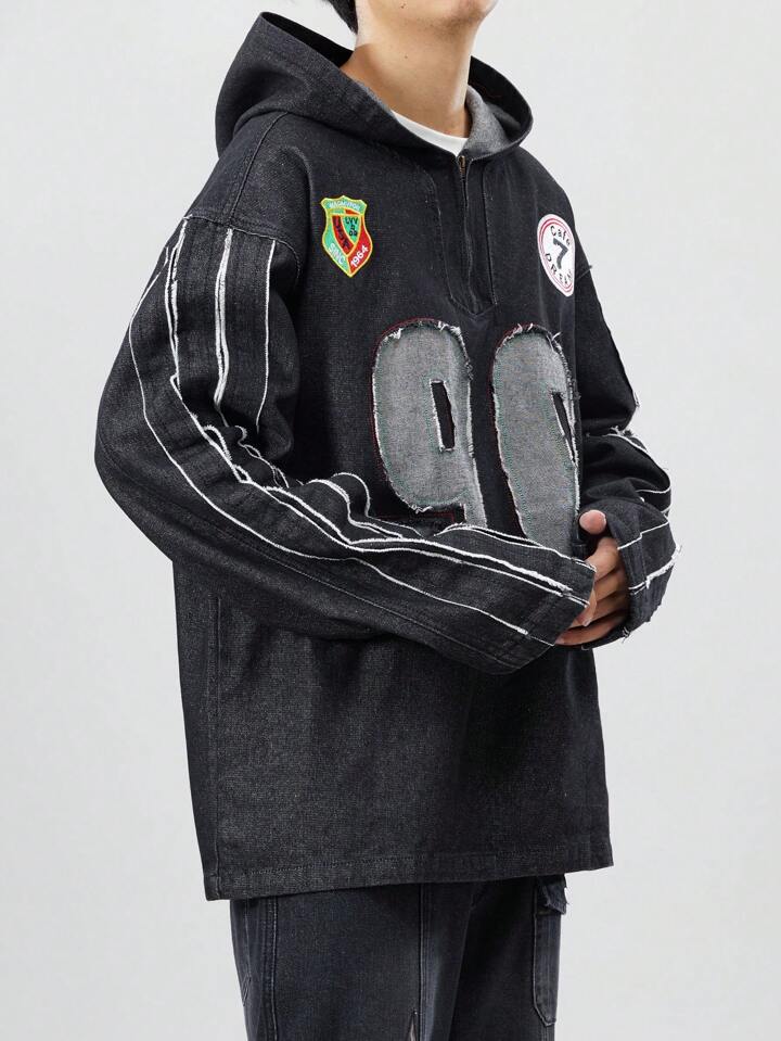 Prep قميص ثقيل رجالي كاجوال ذو أكمام طويلة وقلنسوة من قماش الجينز بتصميم مرقع، أنيق وعصري للشارع