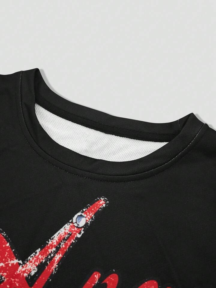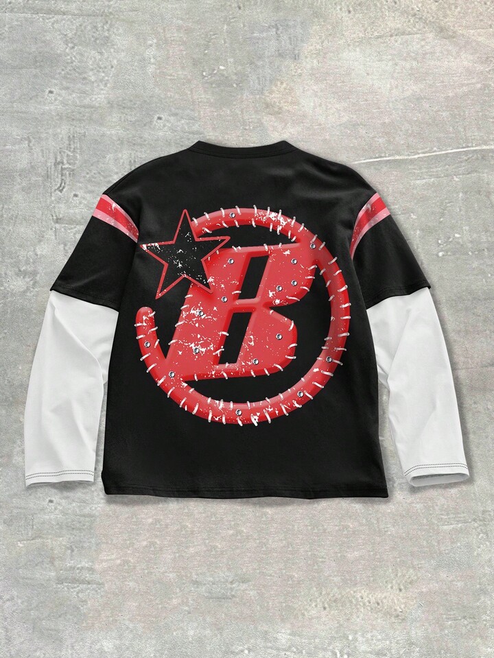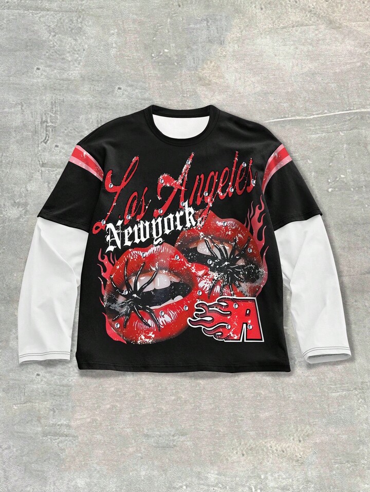 Prep قميص كاجوال بياقة مستديرة بطبعات حرف وشفاه، أكمام طويلة 2 في 1، موسم الخريف للرجال