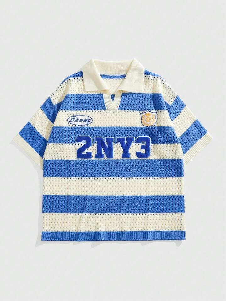 Prep قميص بولو للرجال مفتوح بأكمام قصيرة بتصميم مخطط مطرز