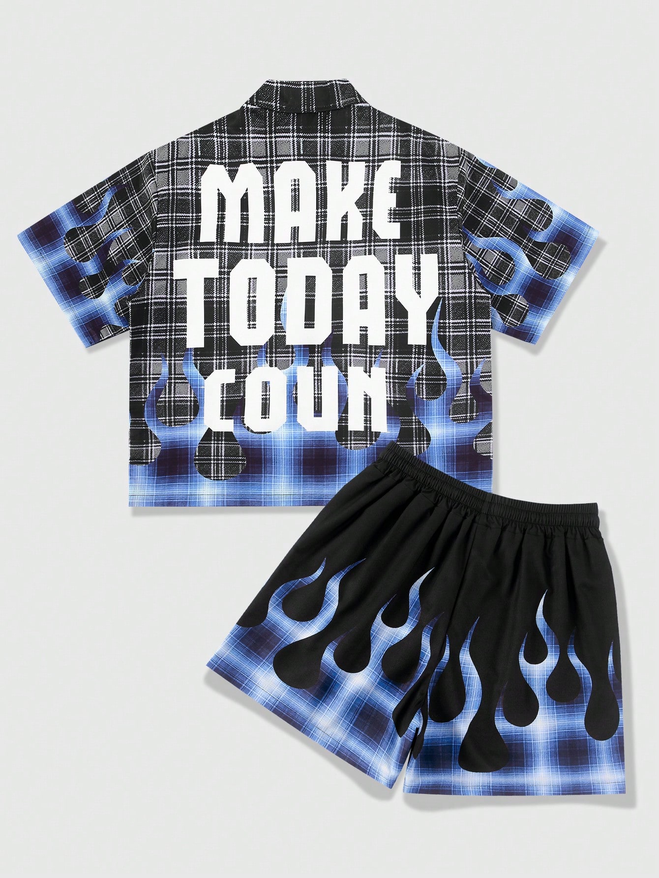 Prep بدلة صيفية للرجال تتكون من قميص بأكمام قصيرة ذو طبعة شعار وشيك وشورت