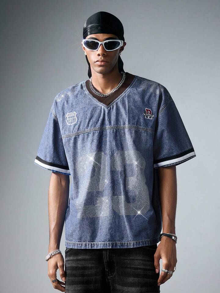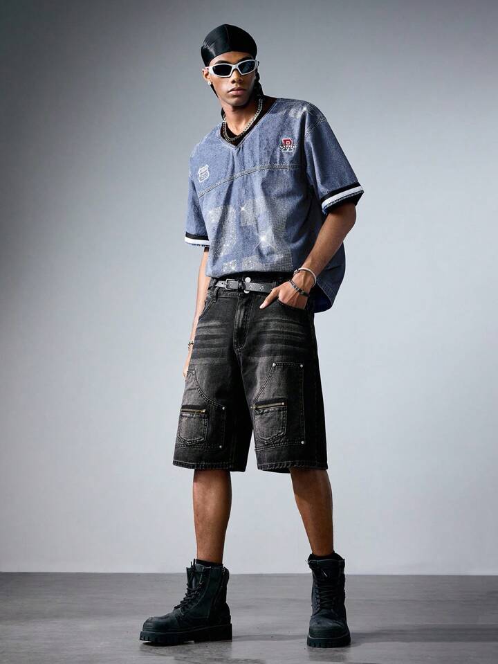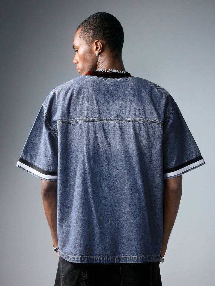 Prep قميص جينز رجالي كاجوال بأكمام قصيرة ورقبة على شكل حرف V ونقشة رقمية