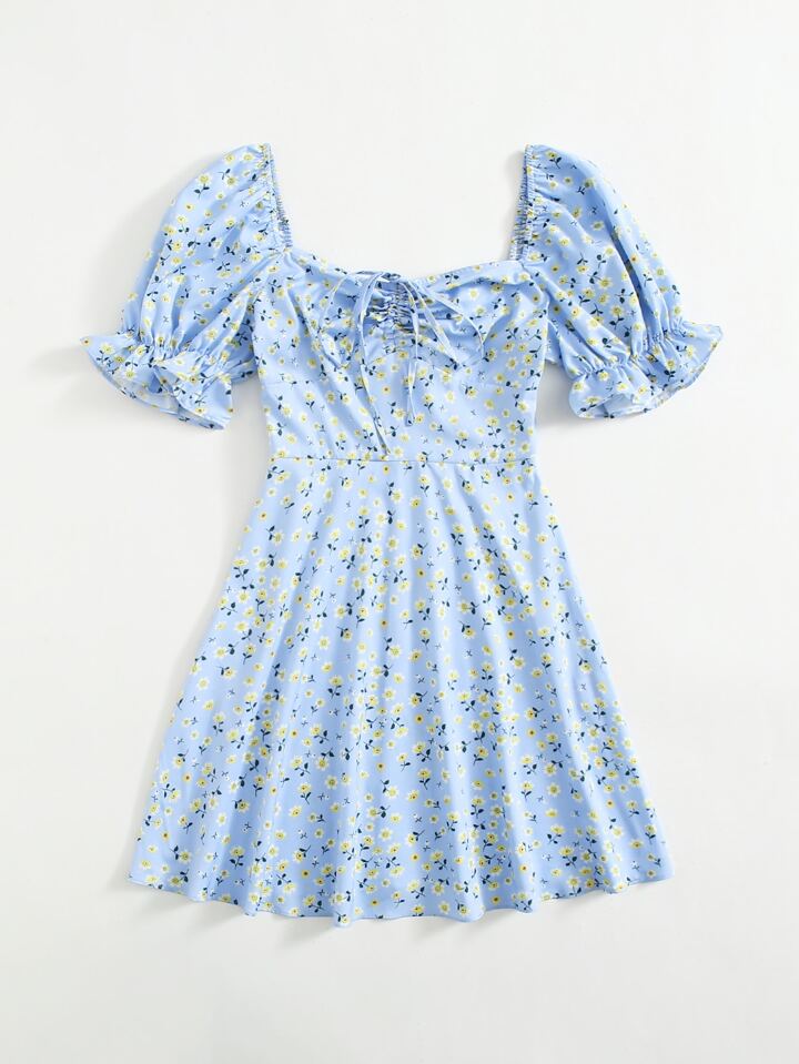 فستان مزهر مدرز امامي وباكمام منفوخ