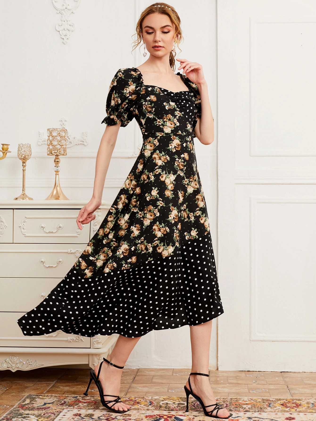 فستان بحافة غير متماثل منقط ومزهر وبعنق سويت هارت وبأكمام منفوخ