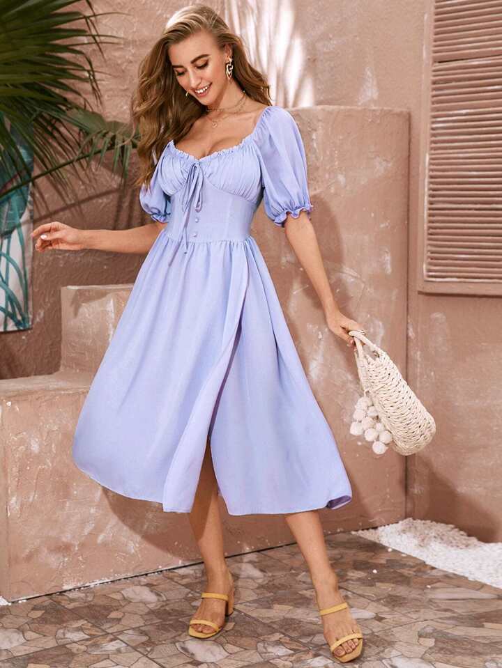 فستان مرضعة بحافة مطوي وبخصر عريض بربطة امامي وبأكمام منفوخ