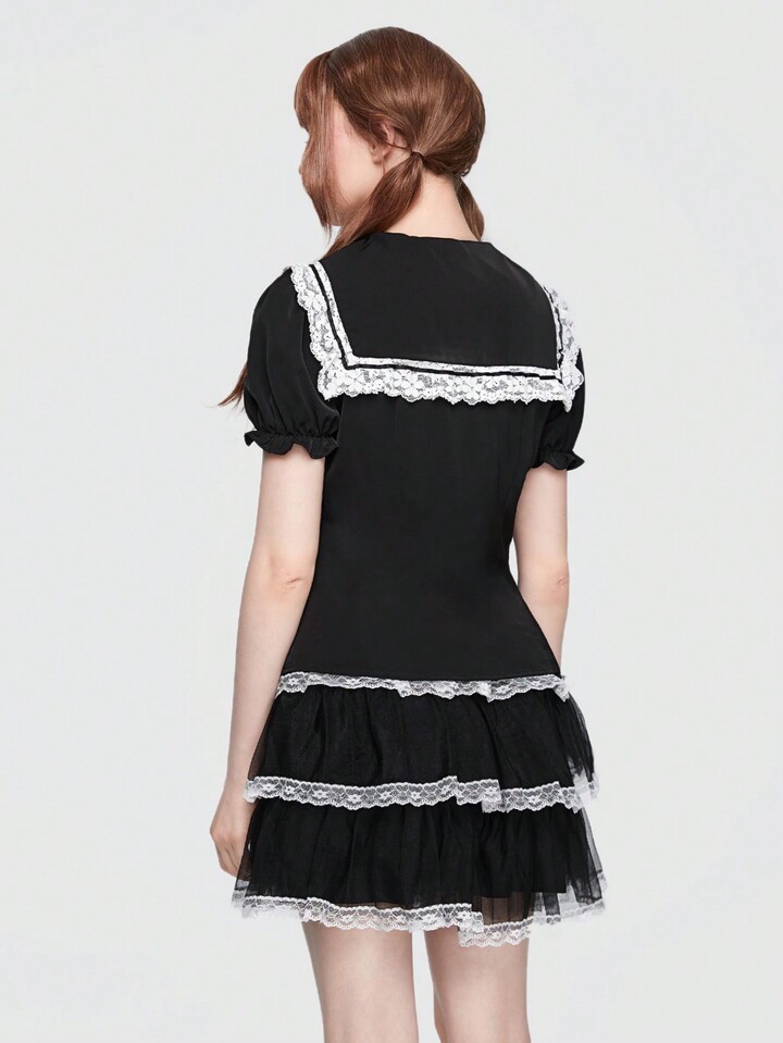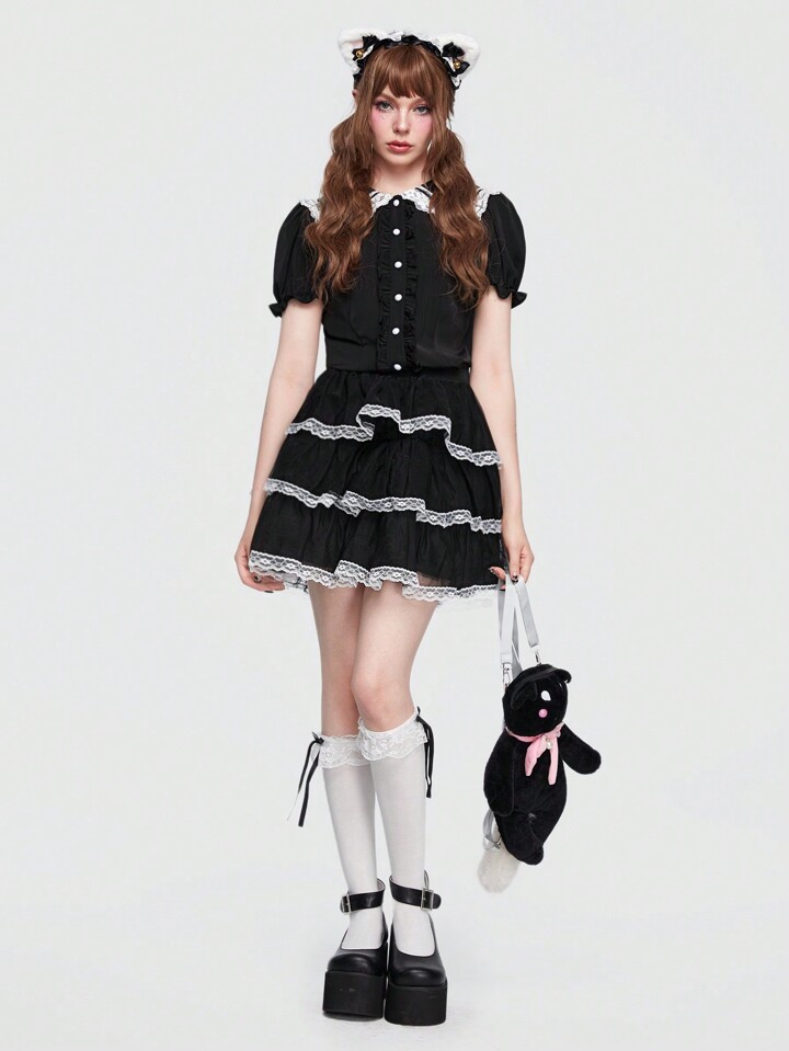 ROMWE Avant قميص دانتيل متباين اللون مقلم بهدب ياقة كبير مبالغ فيه اكمام منتفخة