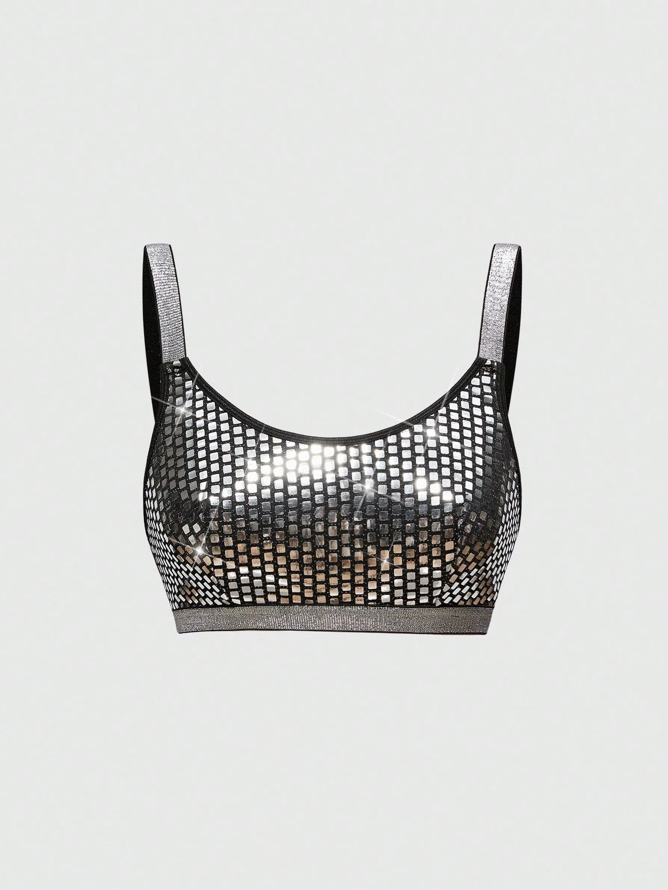 ROMWE Avant حمالة صدر بدون أكمام بتصميم مرصع بالترتر والمعدني، مناسبة لمناسبات الموسيقى والحفلات والمهرجانات