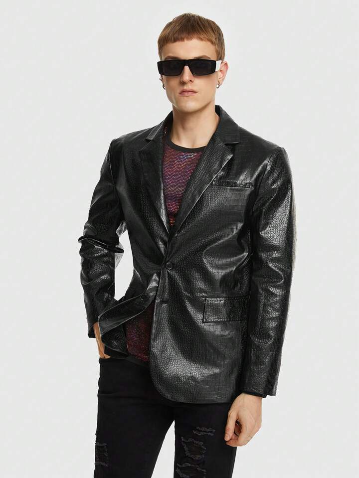ROMWE Avant جاكيت بياقة مطوي مسنن صف ازرار احادية جلد صناعي للشباب