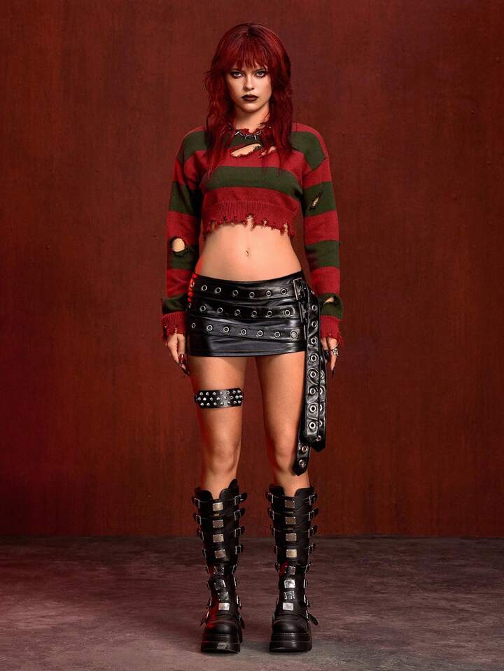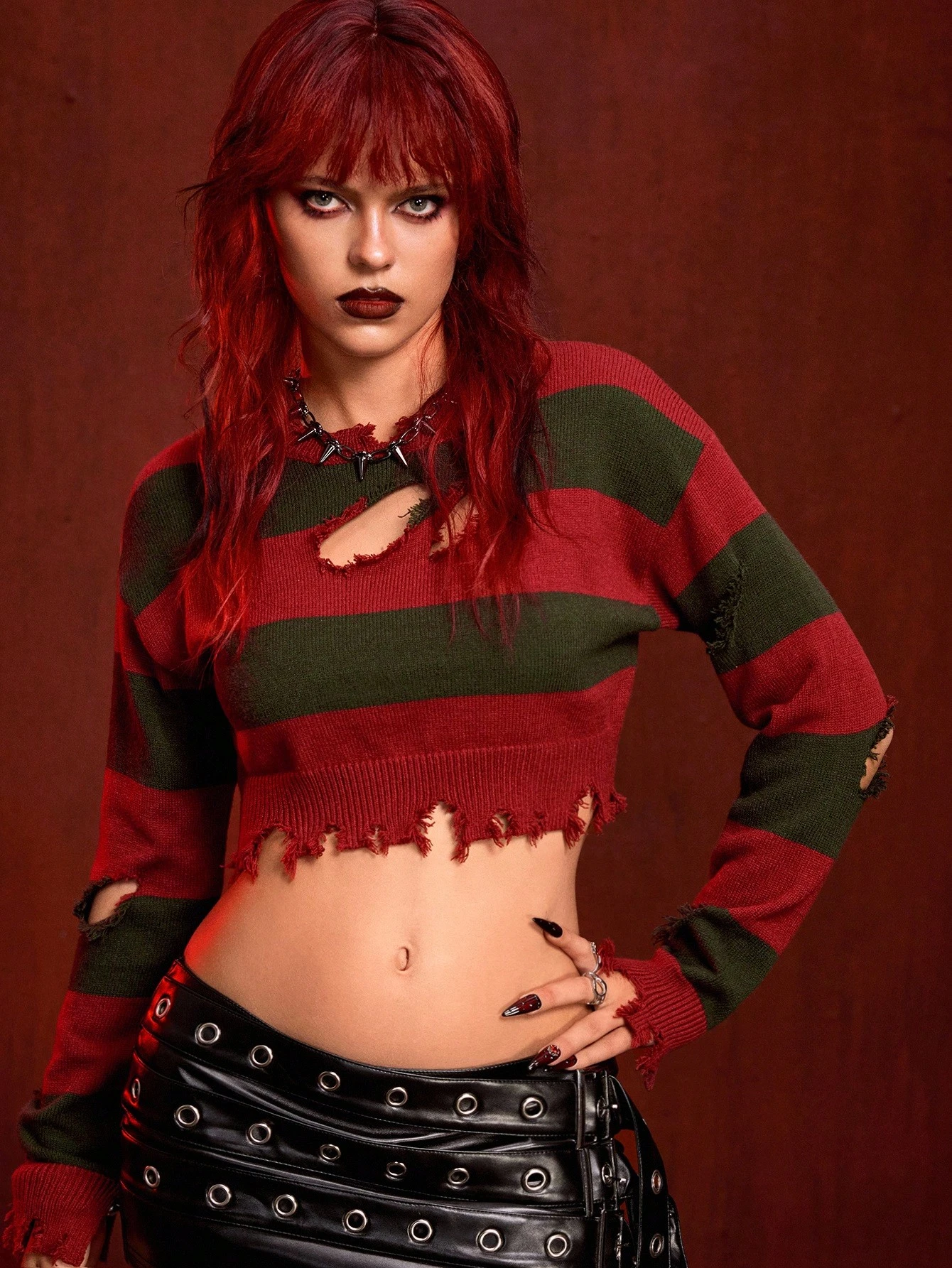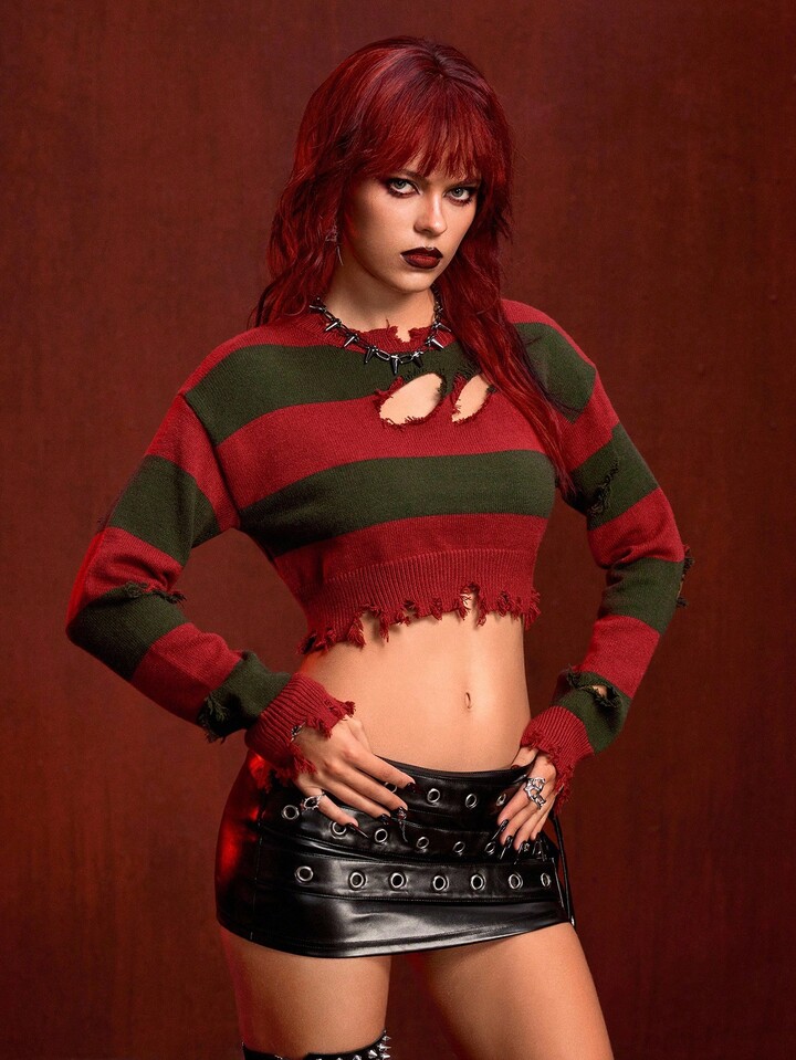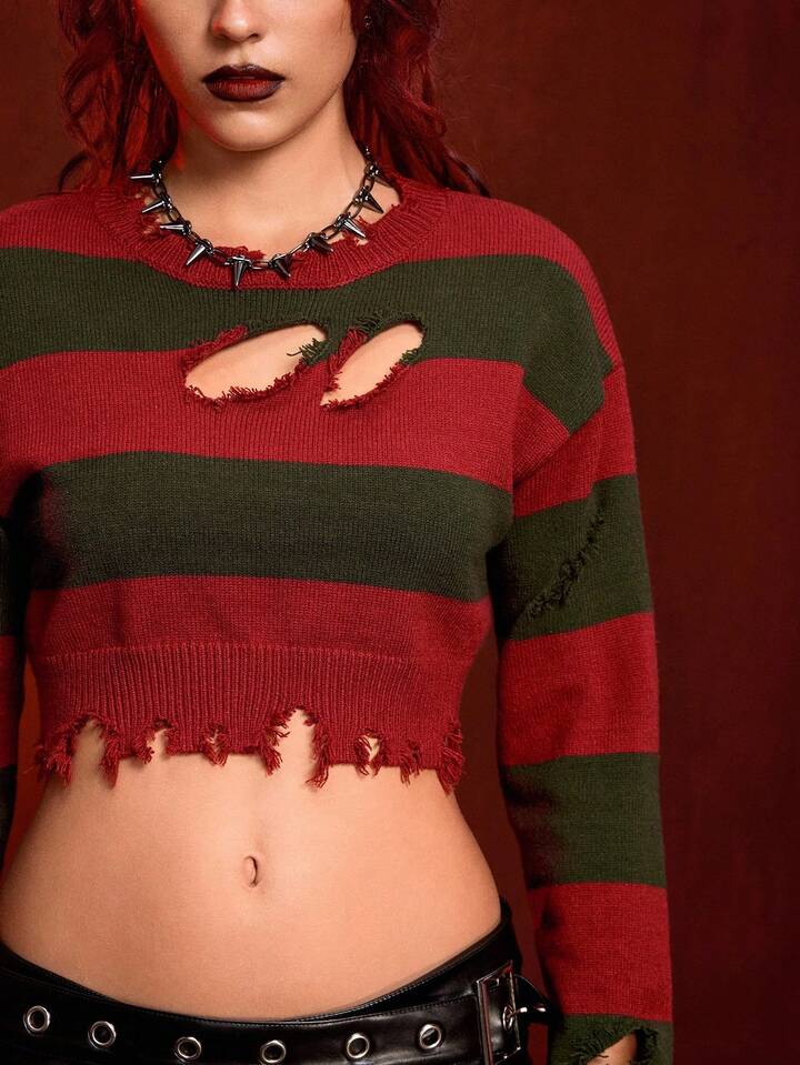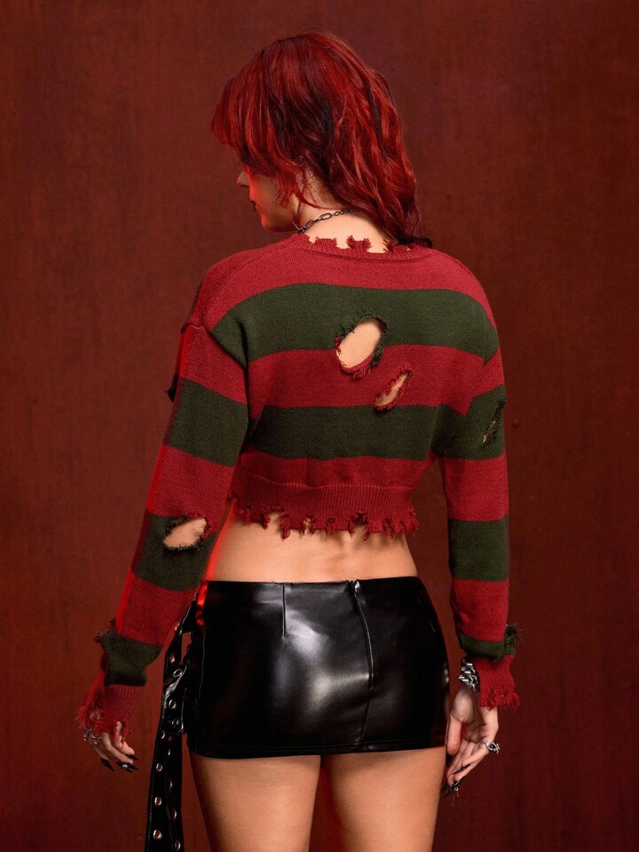 ROMWE Avant كنزة قصيرة للنساء مزينة بتفاصيل مشوهة وخطوط مائلة لموسم هالوين