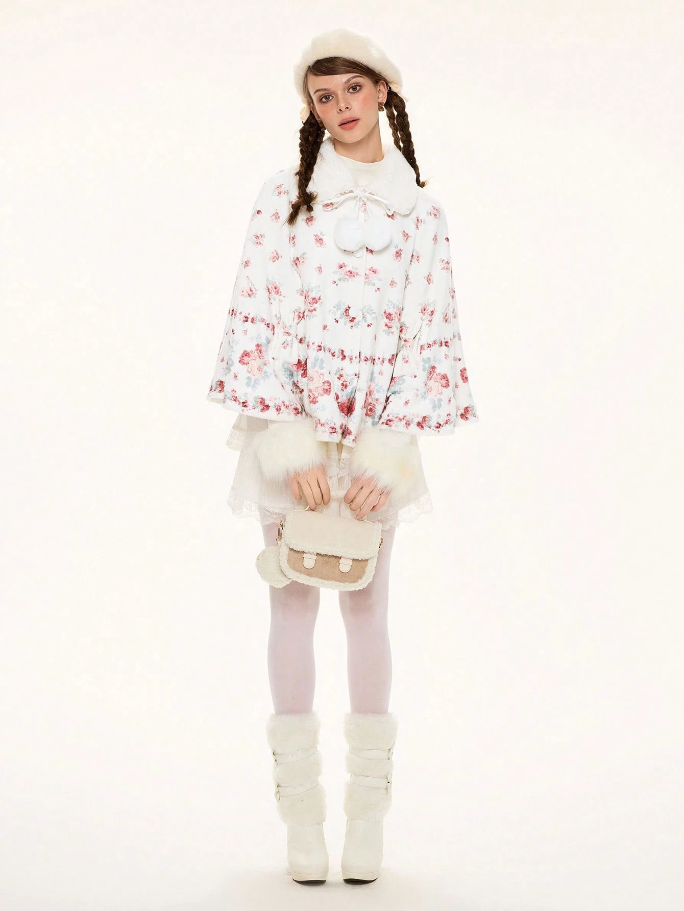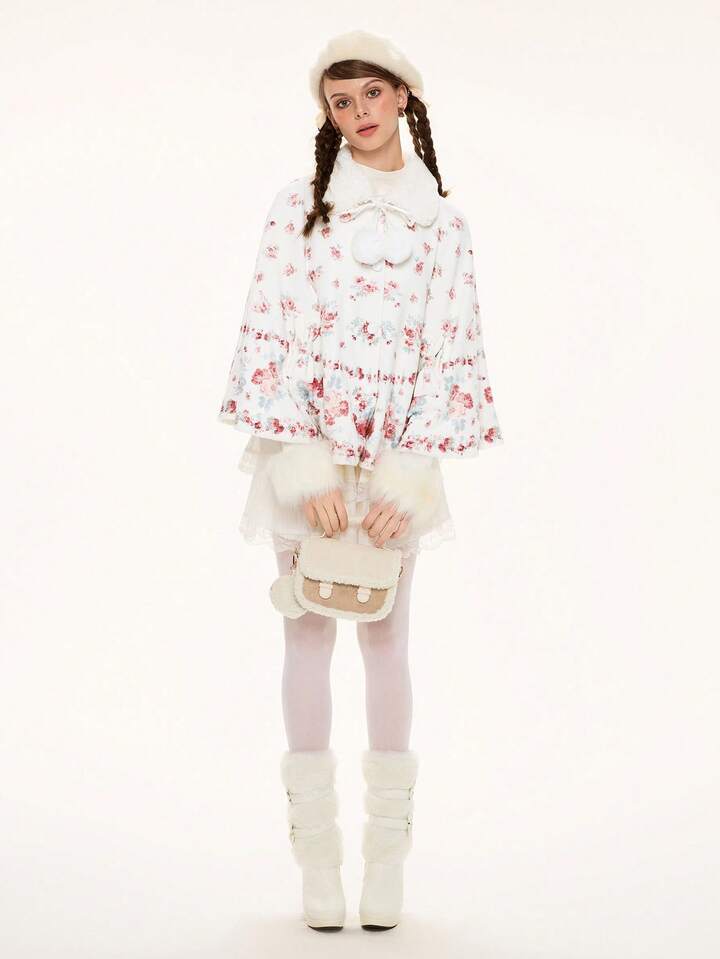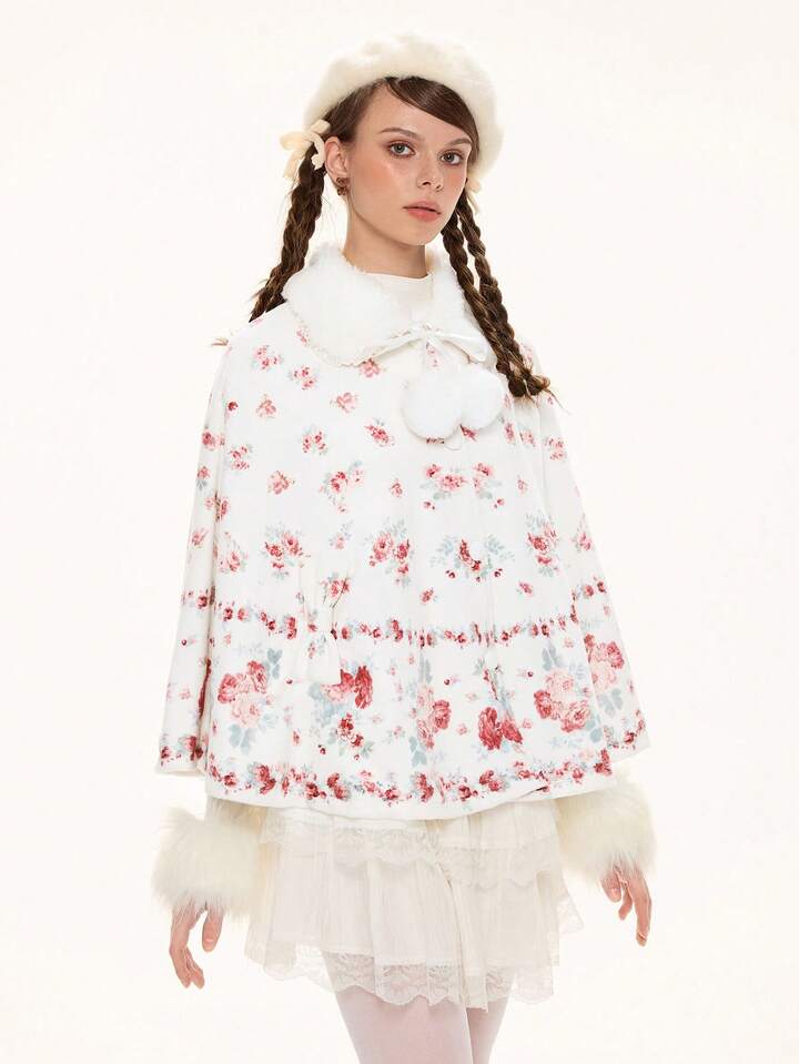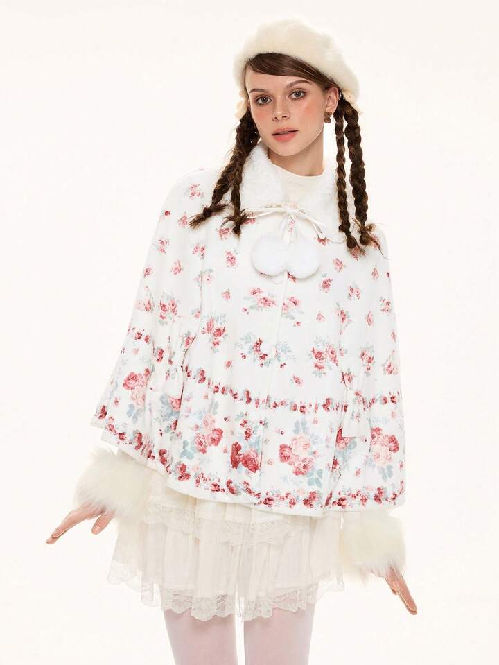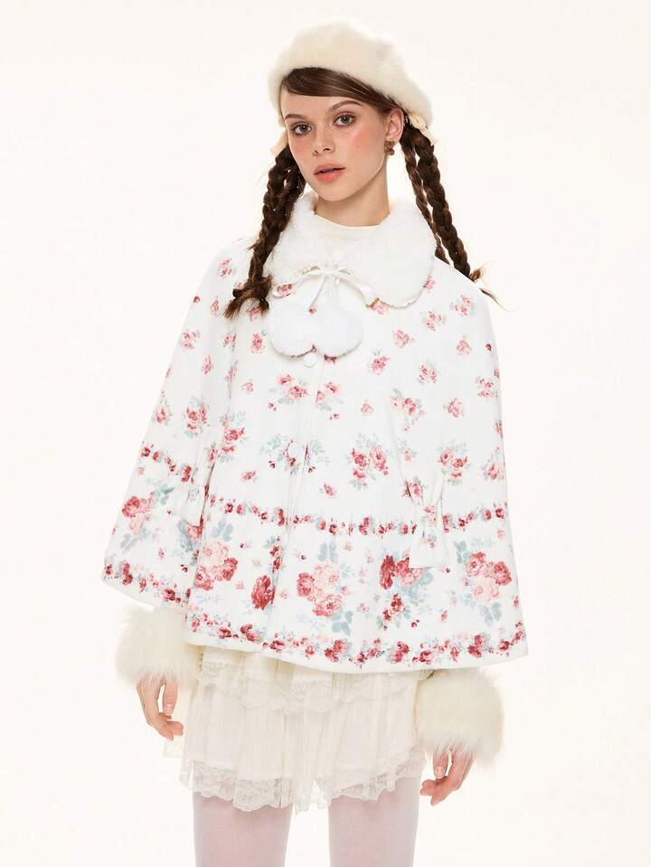 ROMWE Avant معطف كيب مزين بطبعة لطيفة وحلوة من الفرو الاصطناعي للنساء