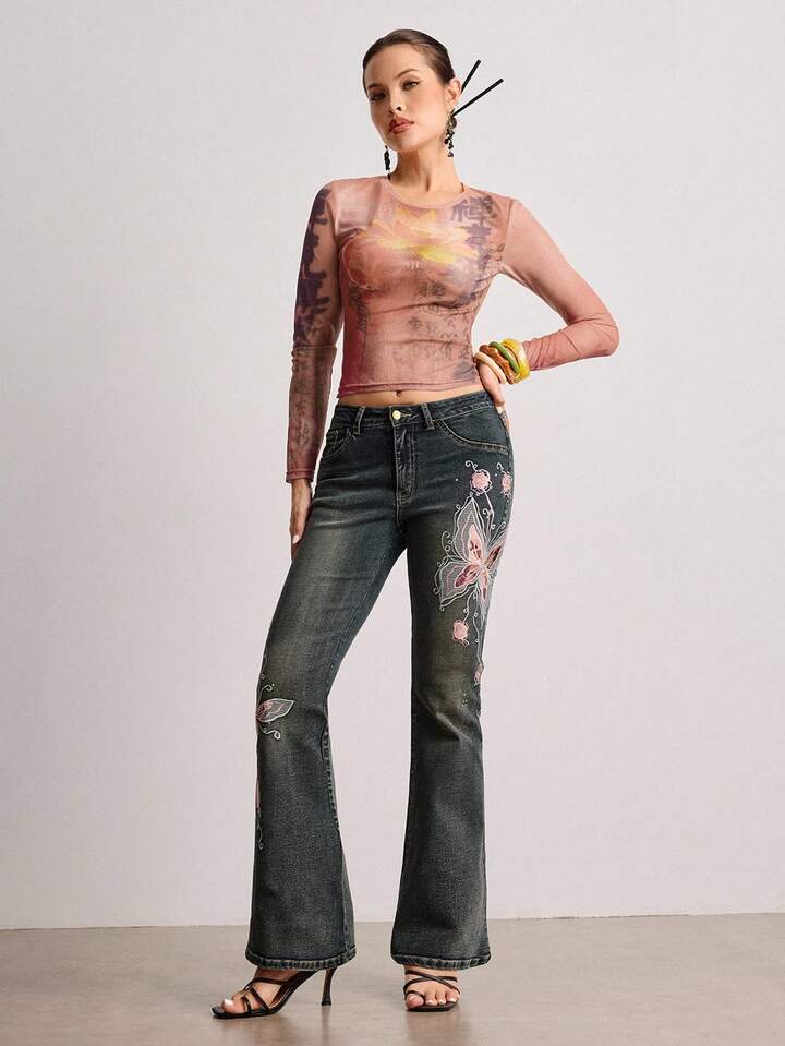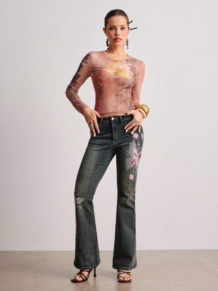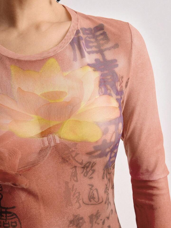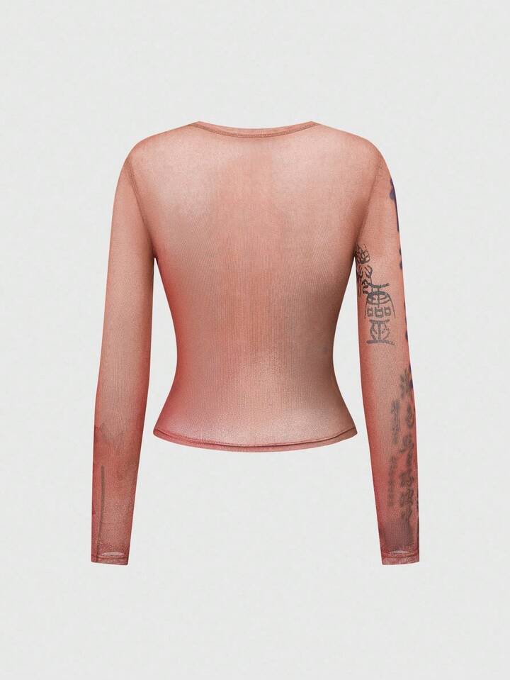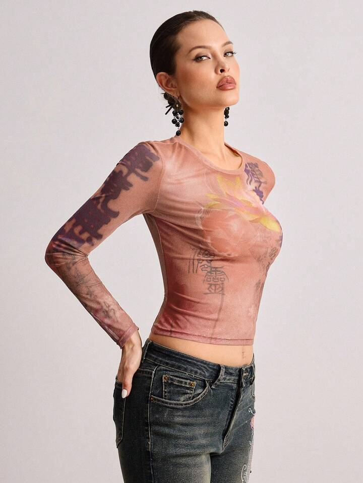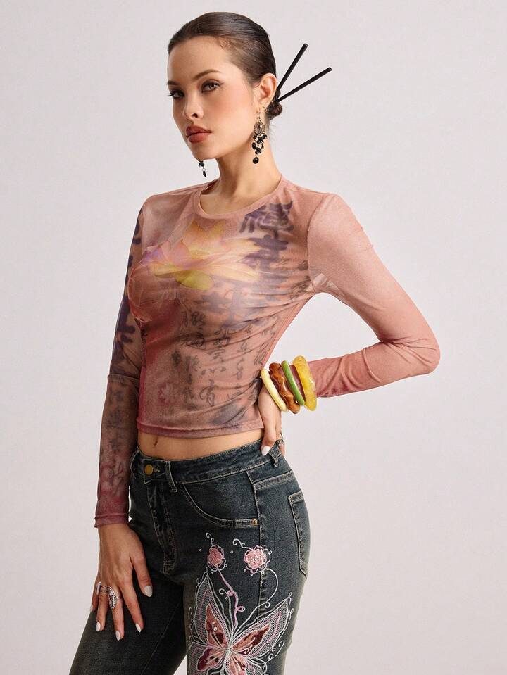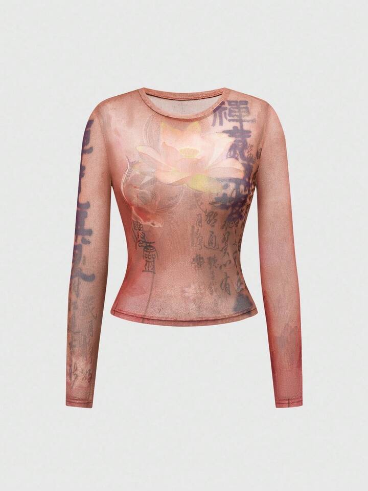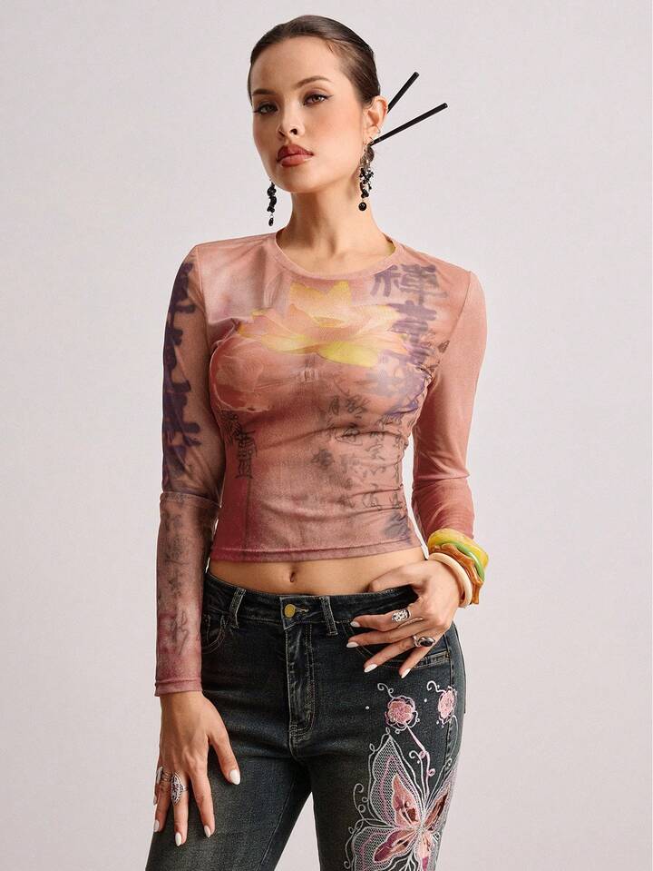 ROMWE Avant بلوزة شفافة للنساء بتصميم صيني تقليدي مزخرف بزهرة اللوتس والأسماك الذهبية وكتابة خطية