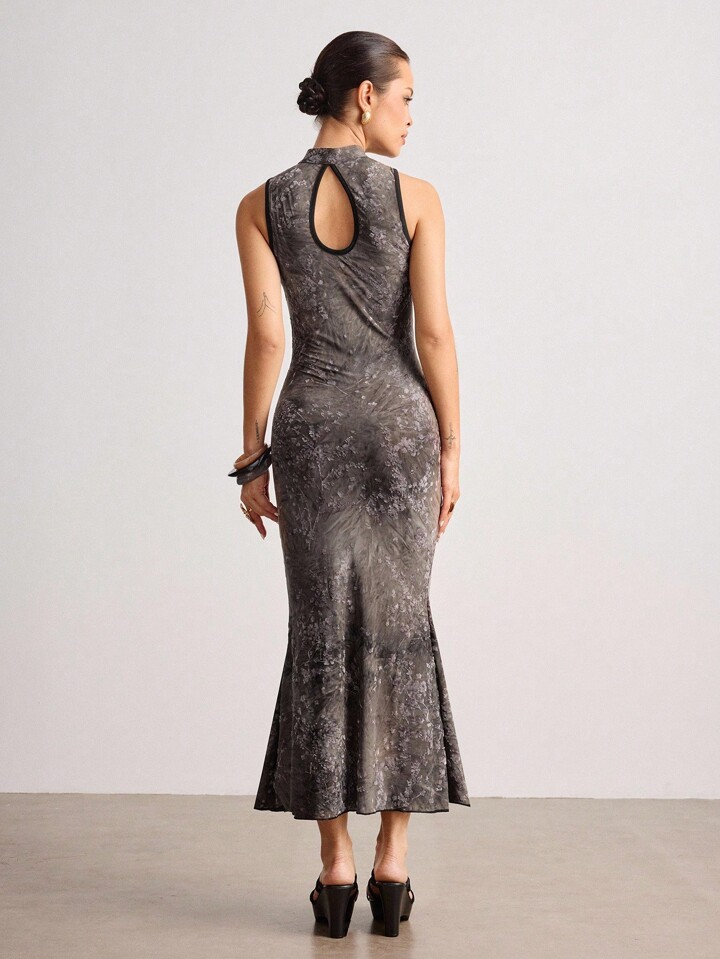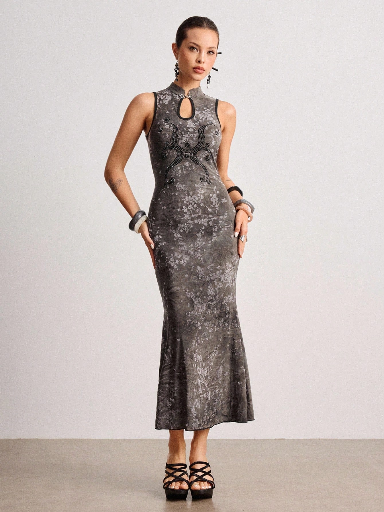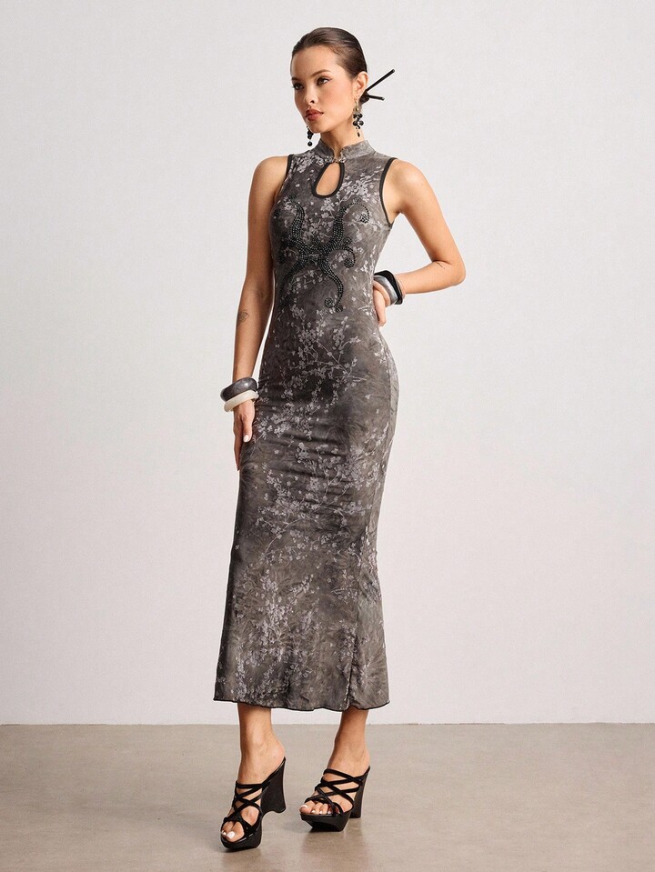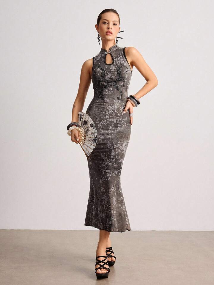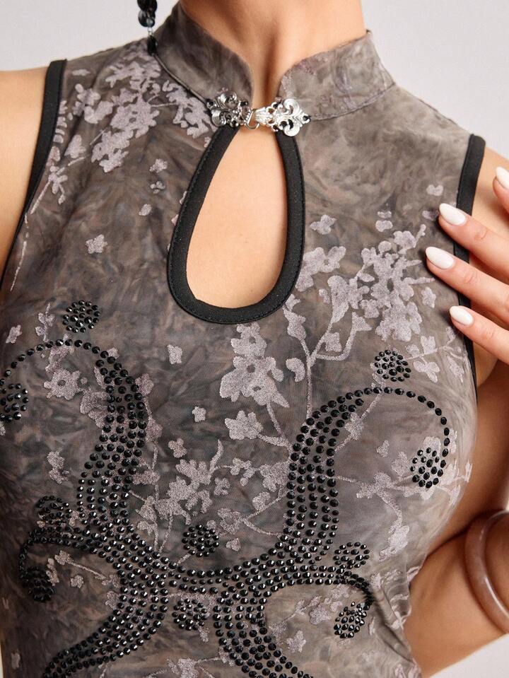 ROMWE Avant تنورة قصيرة بطراز صيني جديد مزينة بالرينستون والصبغ بتقنية الربط