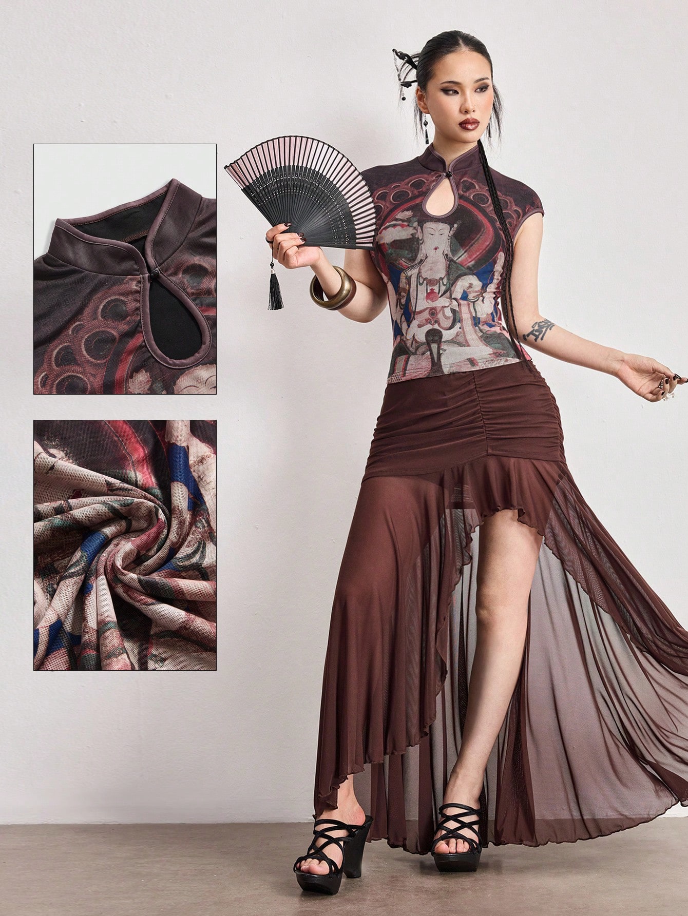 ROMWE Avant ملابس علوية ياقة ماندرين بطباعة شبكية بطراز صيني نيو فينتاج