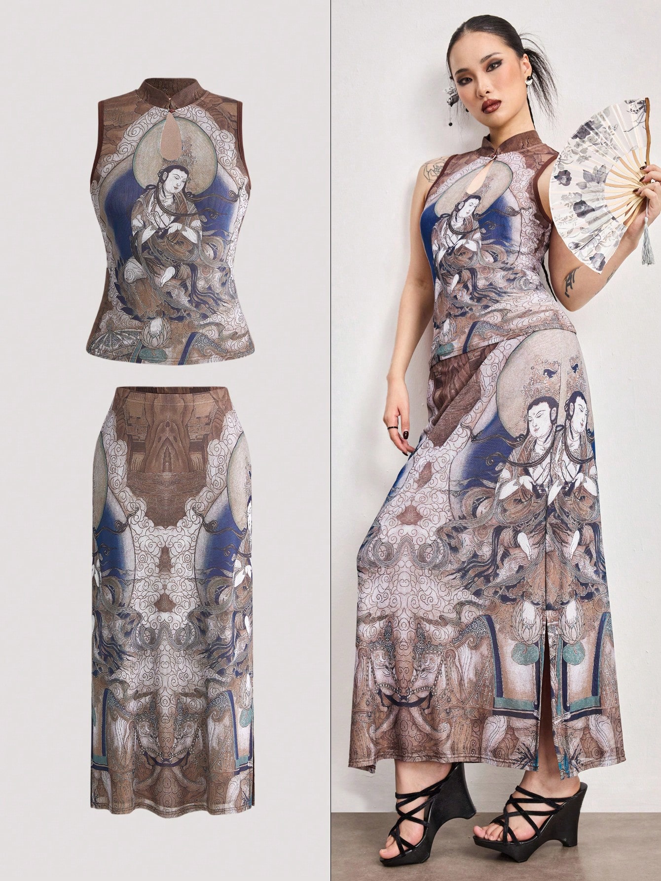 ROMWE Avant طقم أنيق من قطعتين: ملابس علوية بياقة مندرين بدون أكمام مطبوعة بلوحة بوذا على الطراز الصيني وتنورة