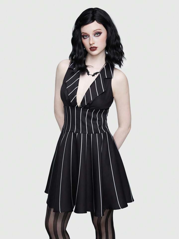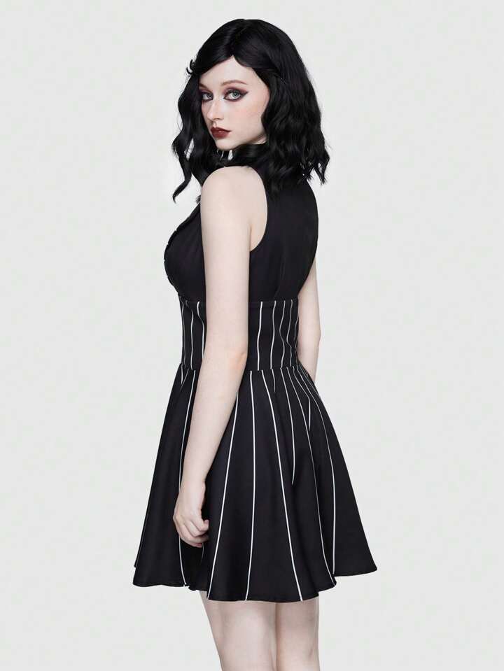 ROMWE Avant فستان زي مخطط ياقة V عميقة بدون أكمام