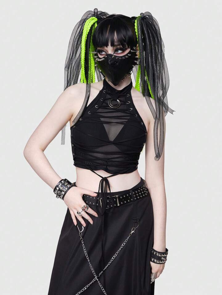 ROMWE Avant سترة بدون اكمام جذابة للنساء على شكل تانك توب بالرقبة المربوطة بشكل عصري و زينة حبلة موضة غوثية