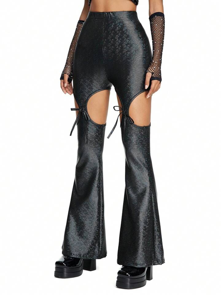 ROMWE Avant بنطلون واسع عالي الخصر للنساء مزين بقوس عالي الجودة وقصات مثقوبة بنسيج بنمط ليزر، مناسب لحضور المهرجانات