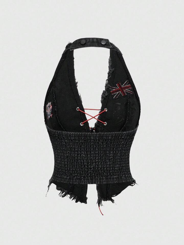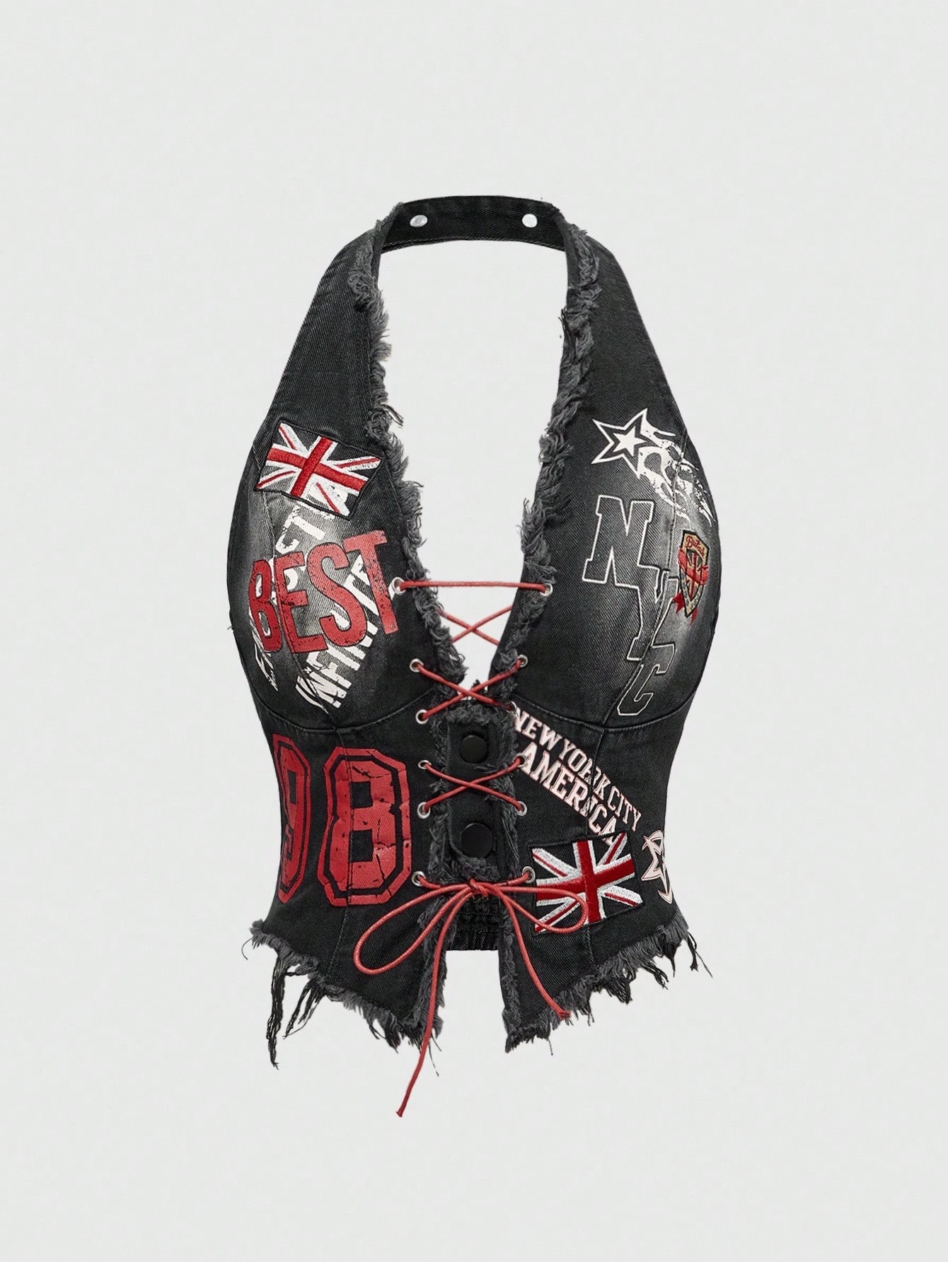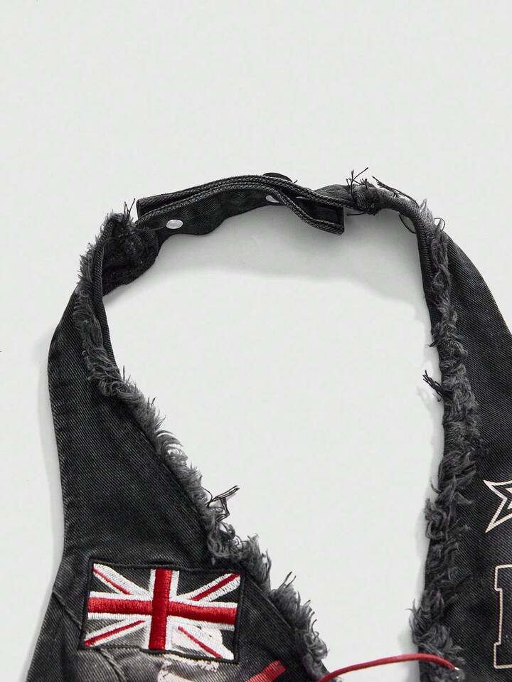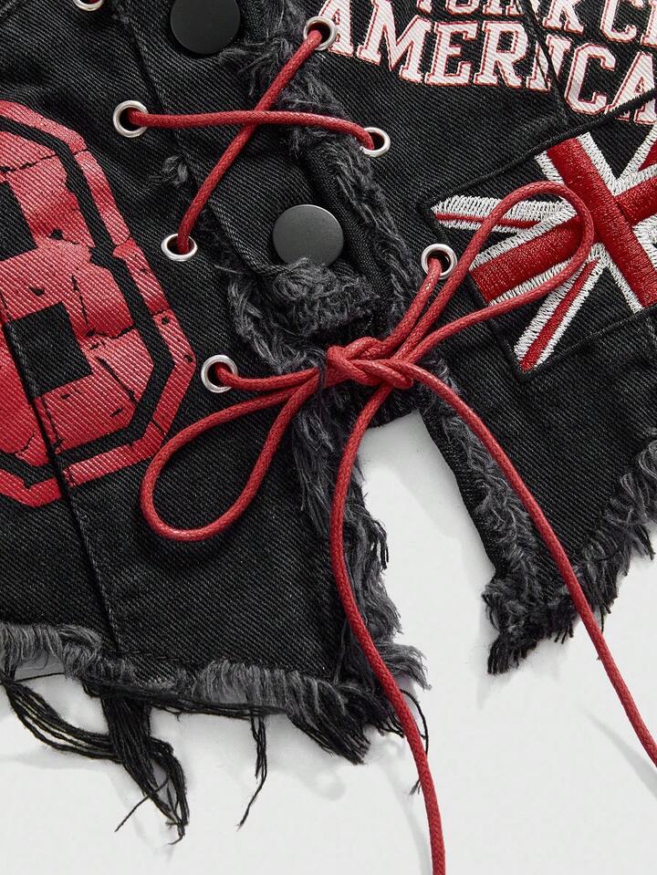 ROMWE Avant ملابس علوية قصير جينز بدون أكمام مطبوع بأرقام وكتابات إنجليزية وعلم بريطاني، بطراز دراجة نارية كلاسيكي، للعودة إلى المدرسة