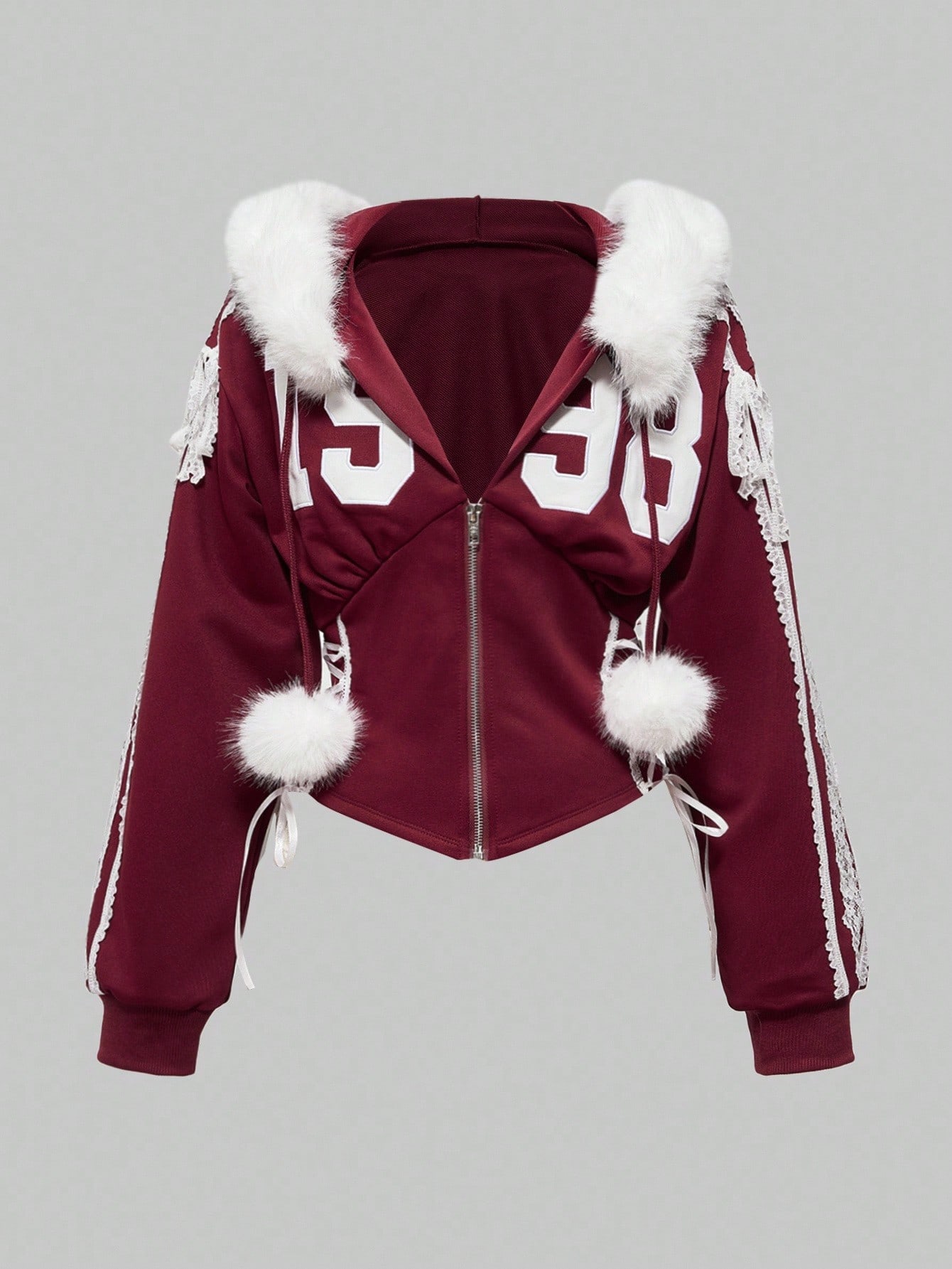 ROMWE Avant هوديي نسائي بتطريز رقمي مزخرف بالدانتيل الفاخر والربط، بتصميم كلية عصري من فترة الألفية الجديدة