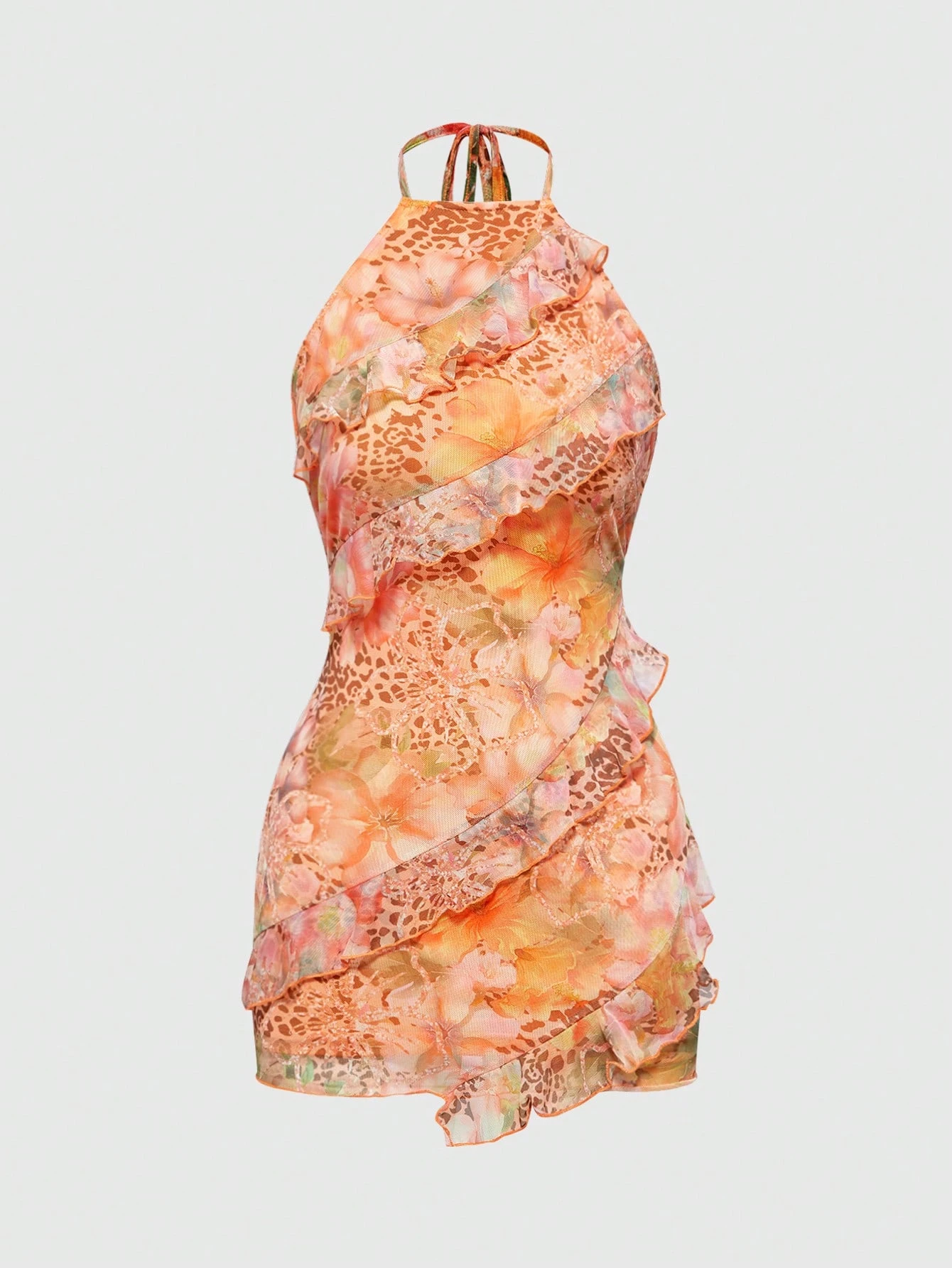 ROMWE Avant فستان طباعة فهد وأزهار بلمسة شيك شاطئية رجعية للنساء