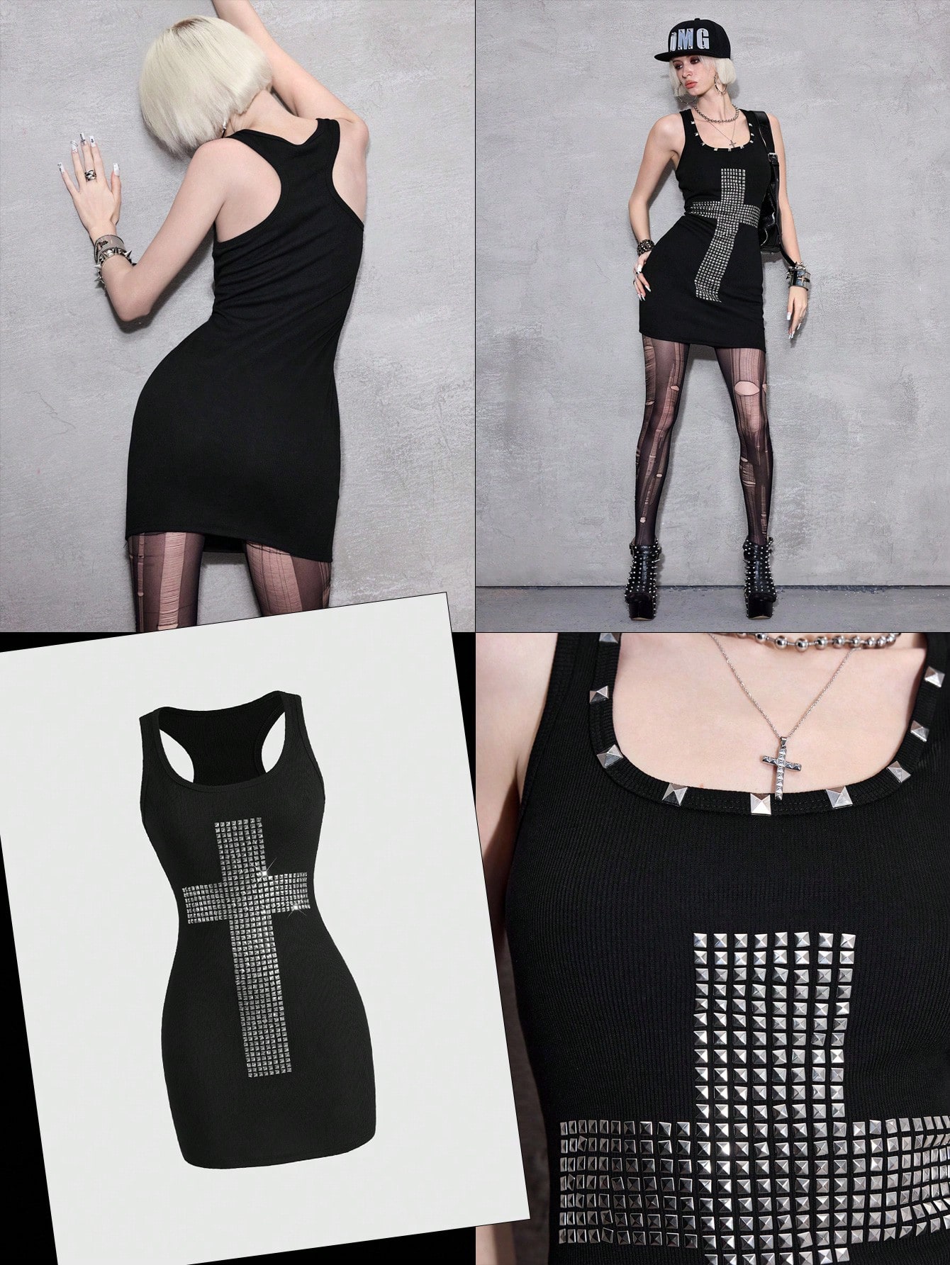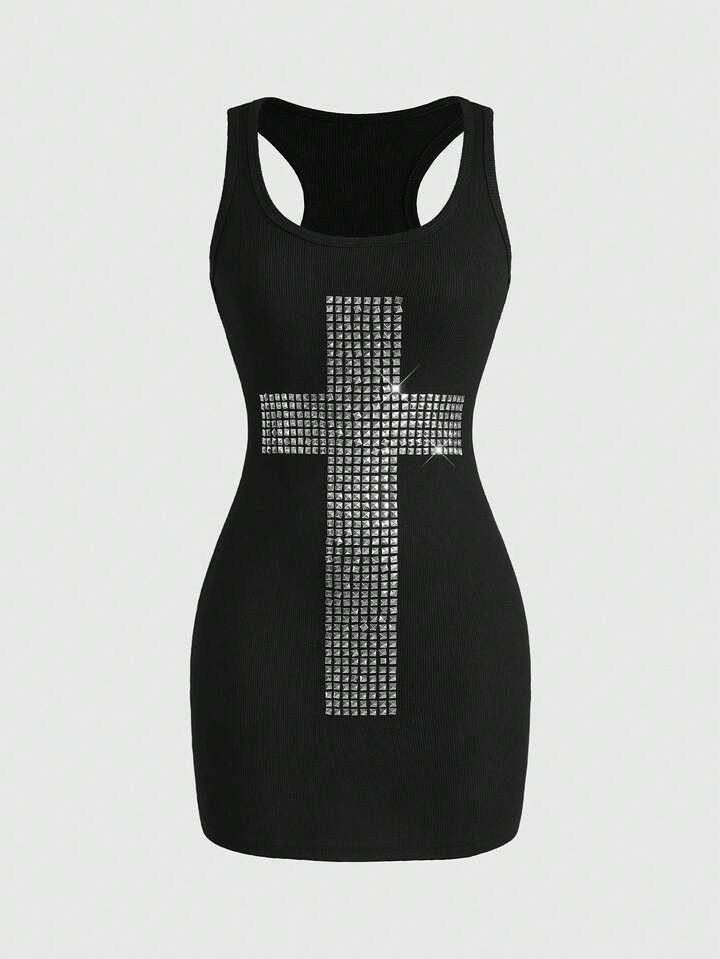 ROMWE Avant فستان قصير مزين بالراين ستون على شكل صليب للنساء