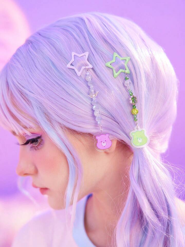 ROMWE X Care Bears مجموعة من 4 مشابك شعر من الخرز بتصميم الرسوم المتحركة المشتركة بين العلامات التجارية بشكل قلب لطيف