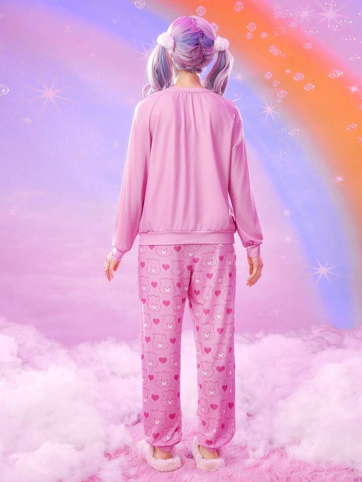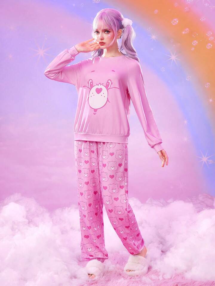 ROMWE X Care Bears طقم بيجامات للنساء يتكون من سروال طويل وبلوزة كم طويل مطبوع عليهما نقوش دبدوب كرتوني، مناسب للخريف والشتاء