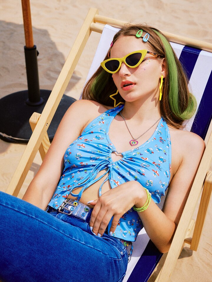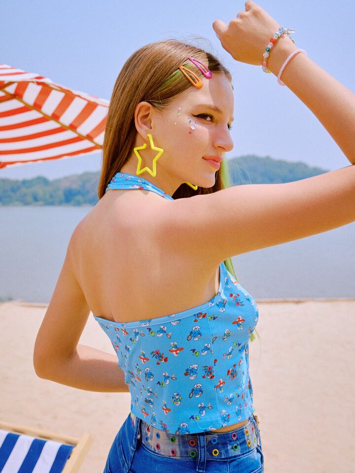 ROMWE X The Smurfs لباس علوي رسن بطباعة رسومات كرتونية خاتم القلب متصل