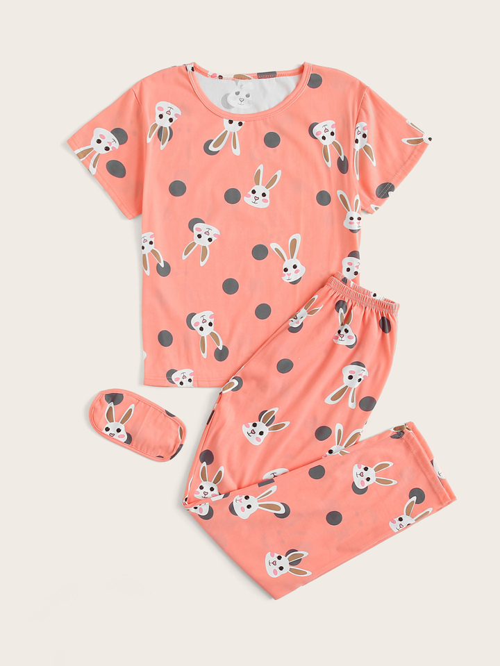 طقم بيجامة بنقشة نقاط القمر وطباعة أرنب مع غطاء للعين