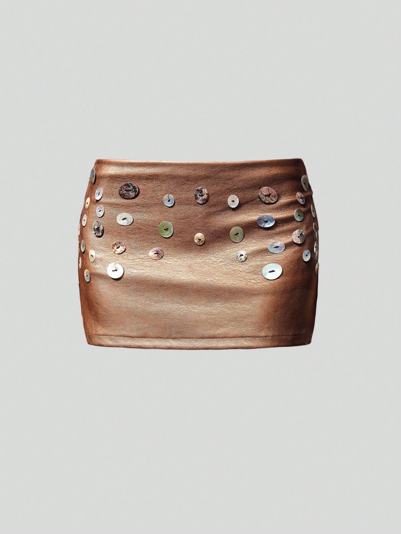 تنورة قصيرة ذات خصر منخفض جدًا مطرزة بتأثير معدني مذهب على شكل صدفة بطراز رجعي جذاب