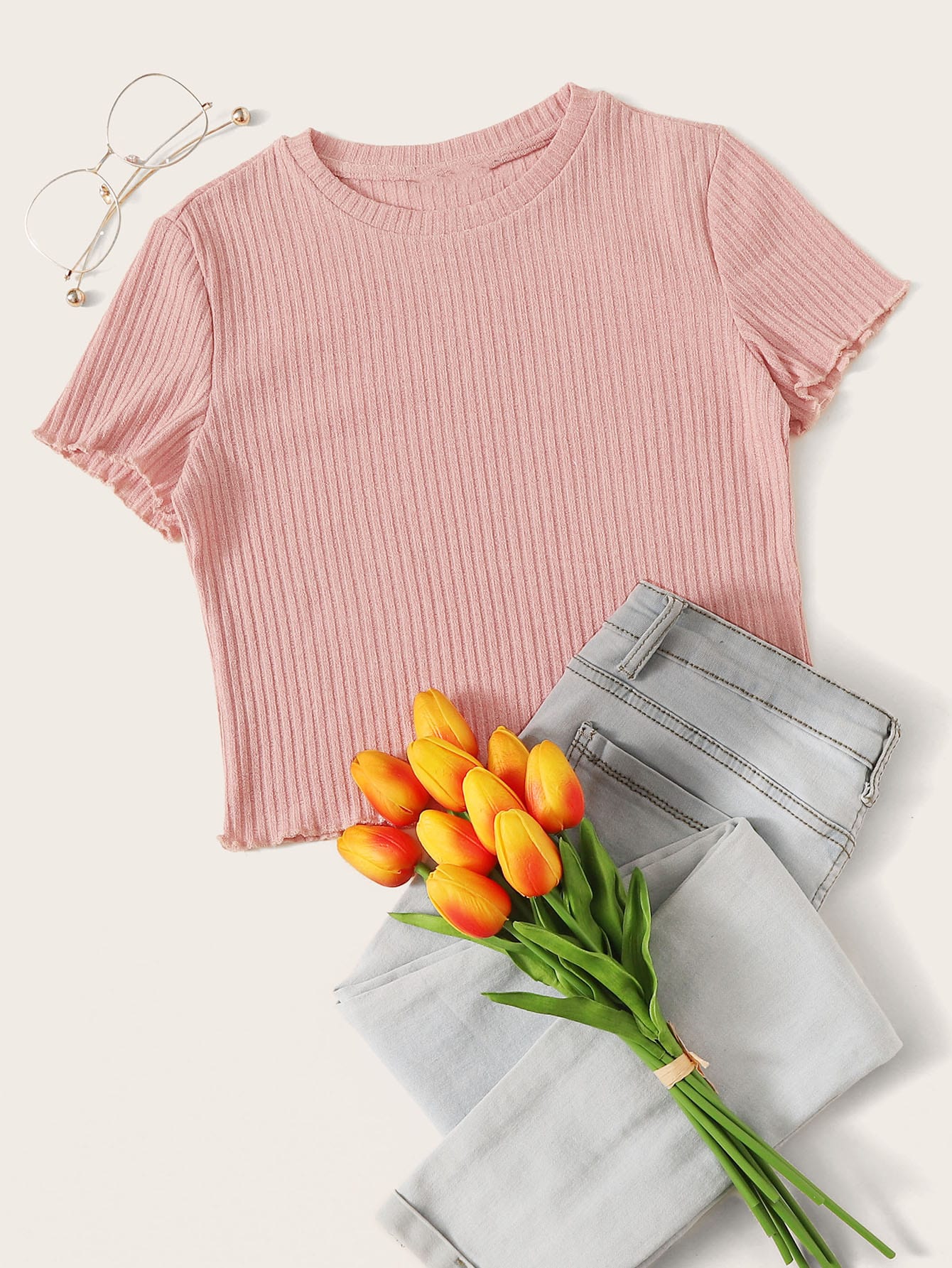 تي شيرت محبوك ومضلع مقلم نمط الخس