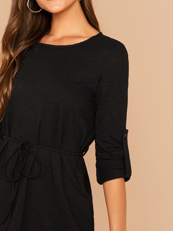 فستان بحزام بحافة منحنية وبأكمام ملتف