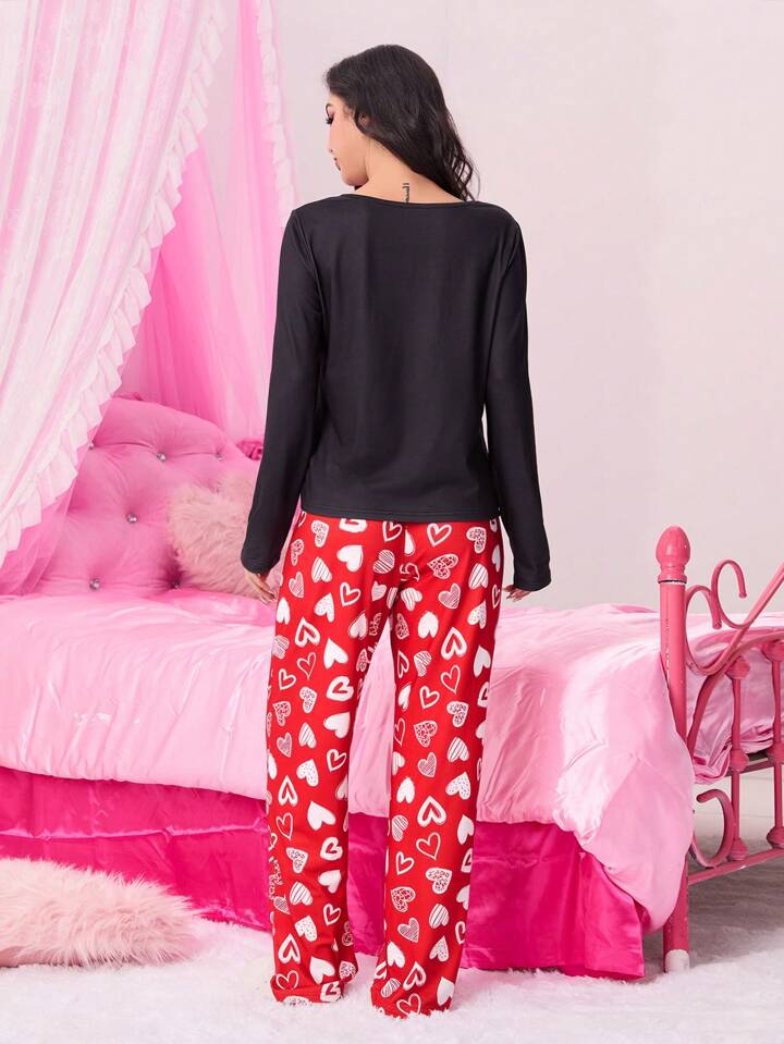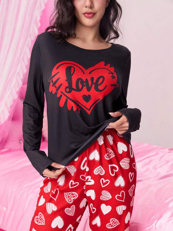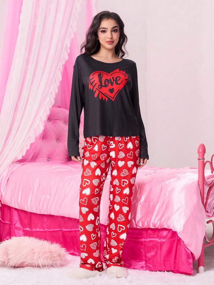 بدلة نوم نسائية كاجوال، سراويل طويلة وكم طويل، مجموعة لعيد الحب الرومانسي