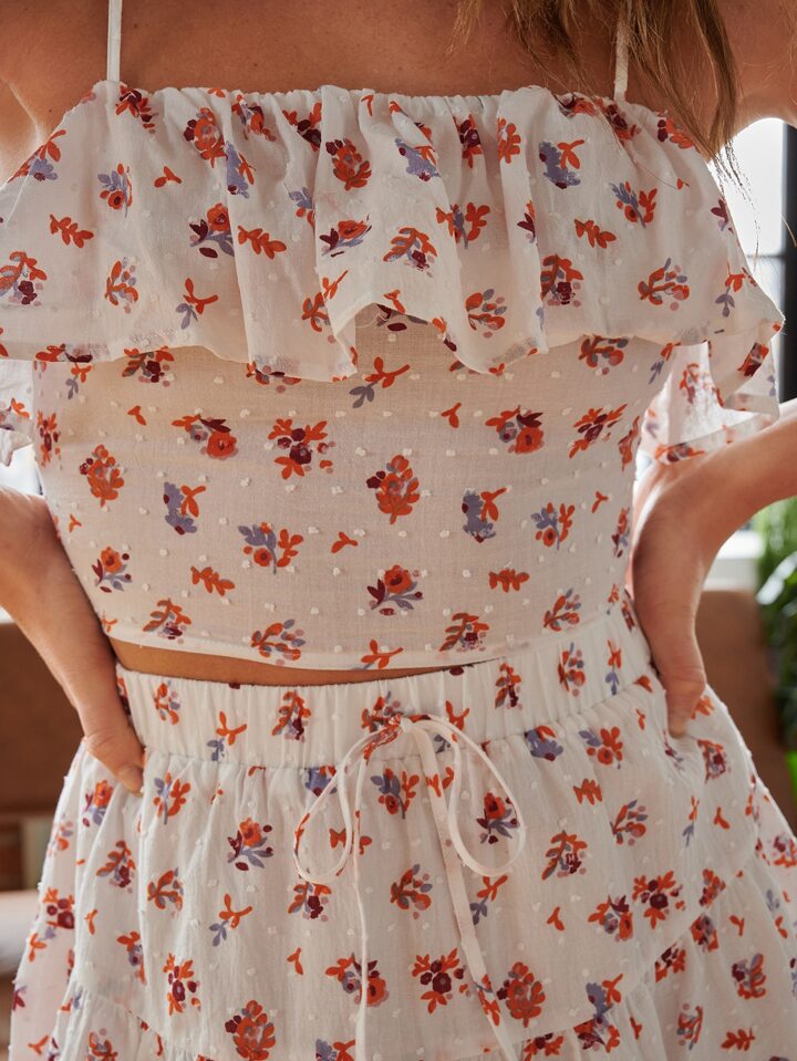 طقم تنورة مع لباس علوي كامي مزهر منقط سويسري مقلم مكشكش