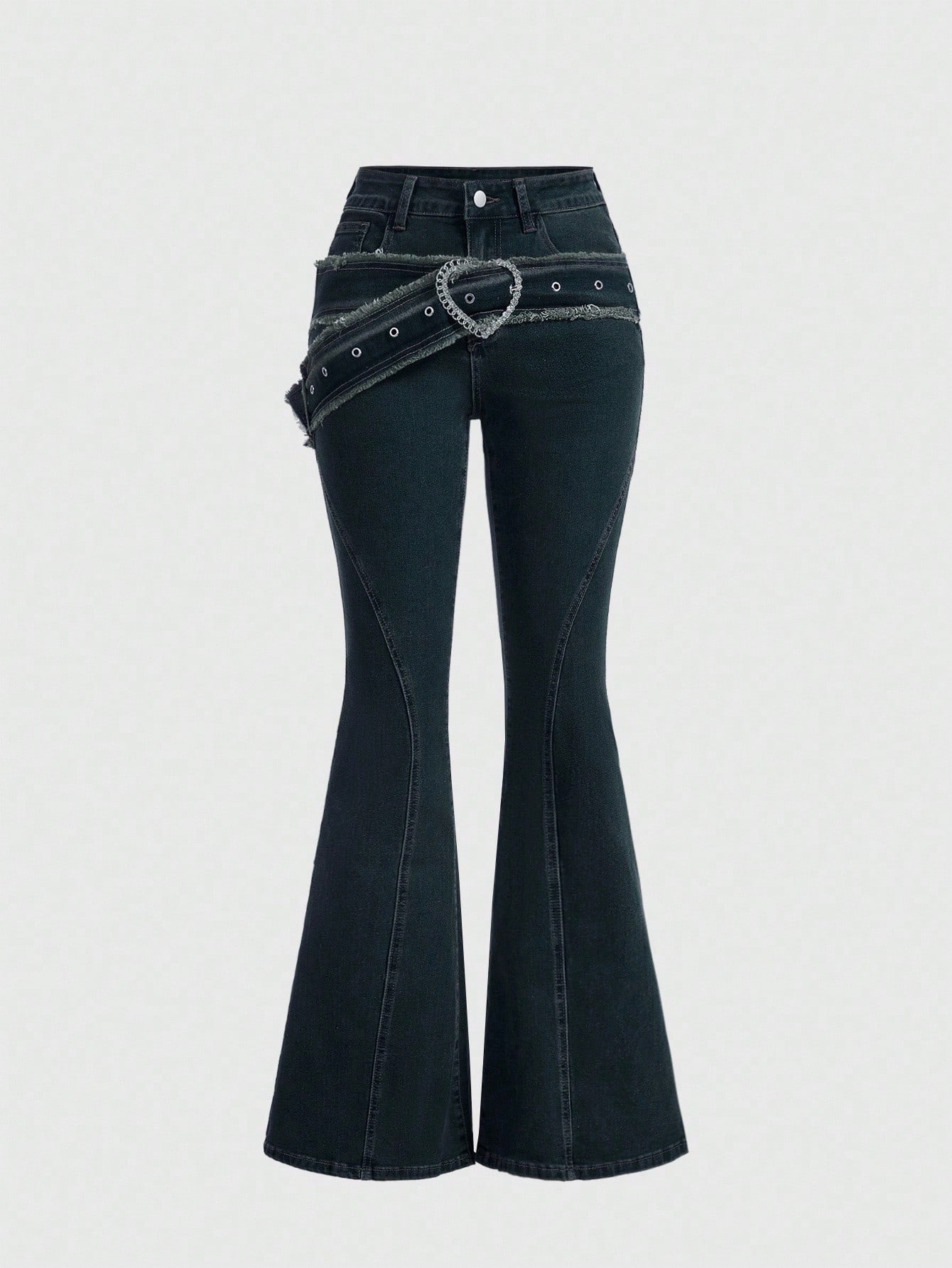 SHEIN x PRISCILA & JIMENA Grunge Punk حزام خصر معدني بتصميم قلب على الطراز الرجعي Y2K مع شراريب للنساء، وبنطلون جينز أزرق بقصة واسعة من الأسفل وخصر منخفض مناسب للارتداء اليومي الكاجوال في الربيع والخريف
