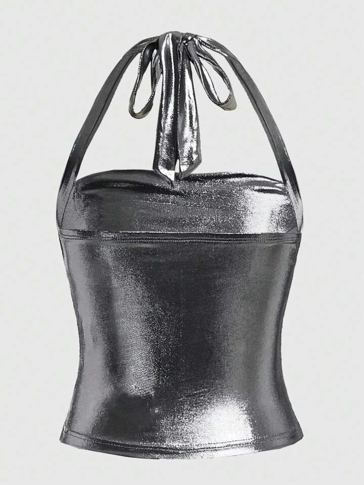 SHEIN x PRISCILA & JIMENA ملابس علوية نسائية معدنية بياقة حلقية، مدرسة