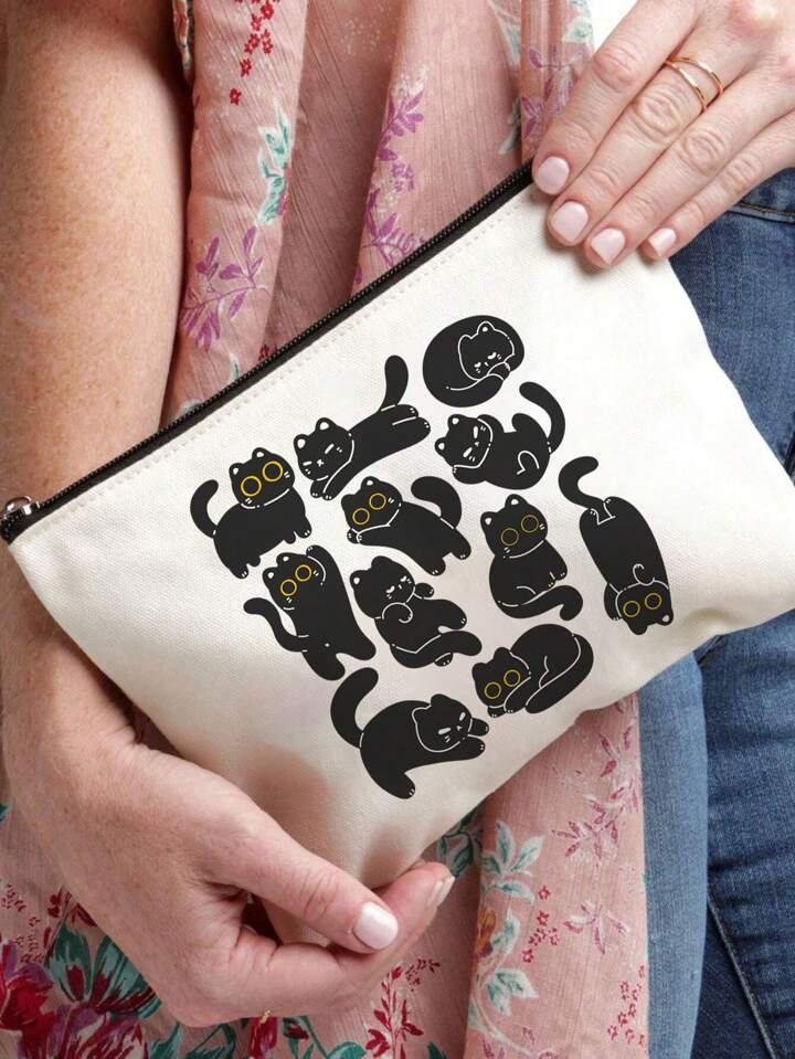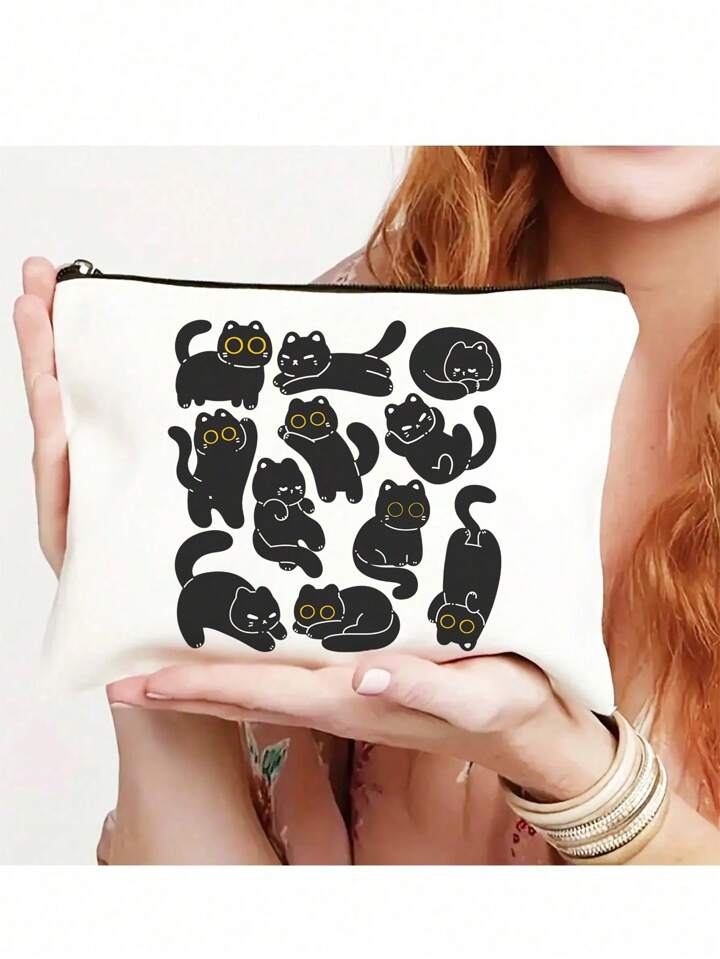 Satchi Collection حقيبة مستحضرات تجميل مطبوعة بقطة سوداء كرتونية بسيطة قطعة واحدة، منظم أدوات المكياج للسفر، أكياس قرطاسية للطلاب