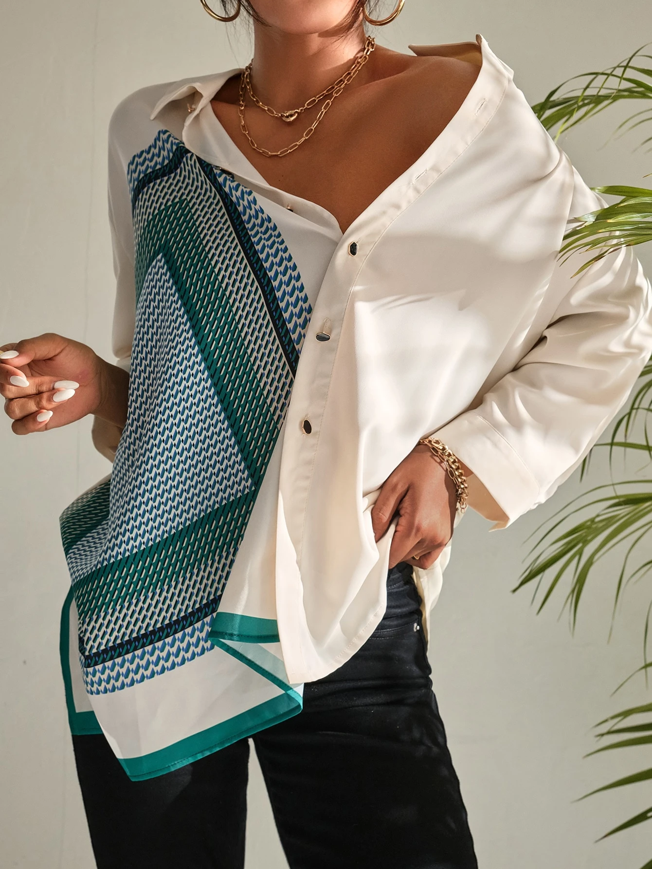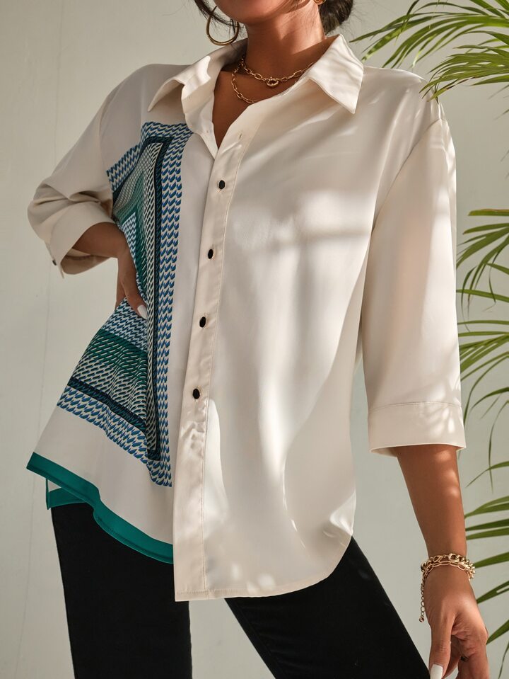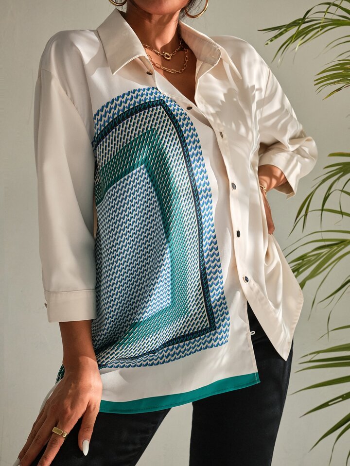 قميص كبير بحافة غير متماثلة وطباعة وشاح