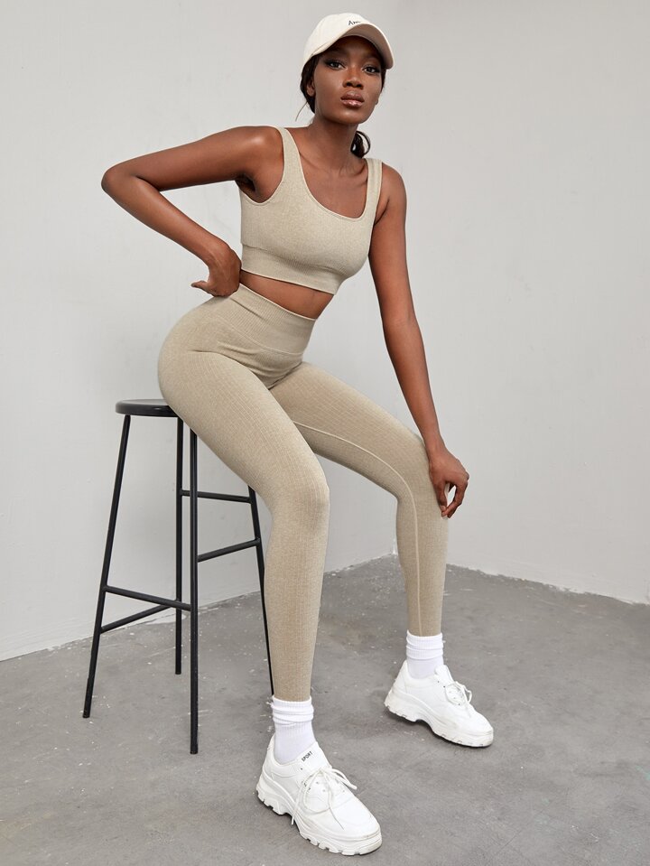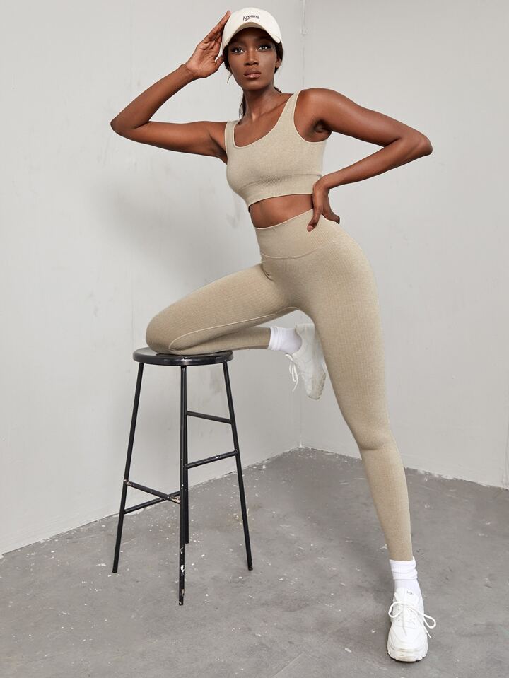 طقم ملابس رياضية نسائي يتكون من حمالة صدر رياضية مطاطية عالية الإطالة وسروال ضيق