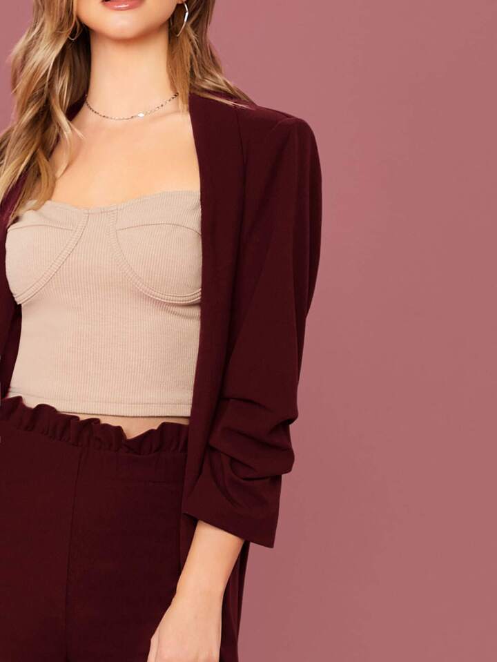 طقم سروال بخصر جيب ورقي مع بليزر بلون موحد وبياقة شال