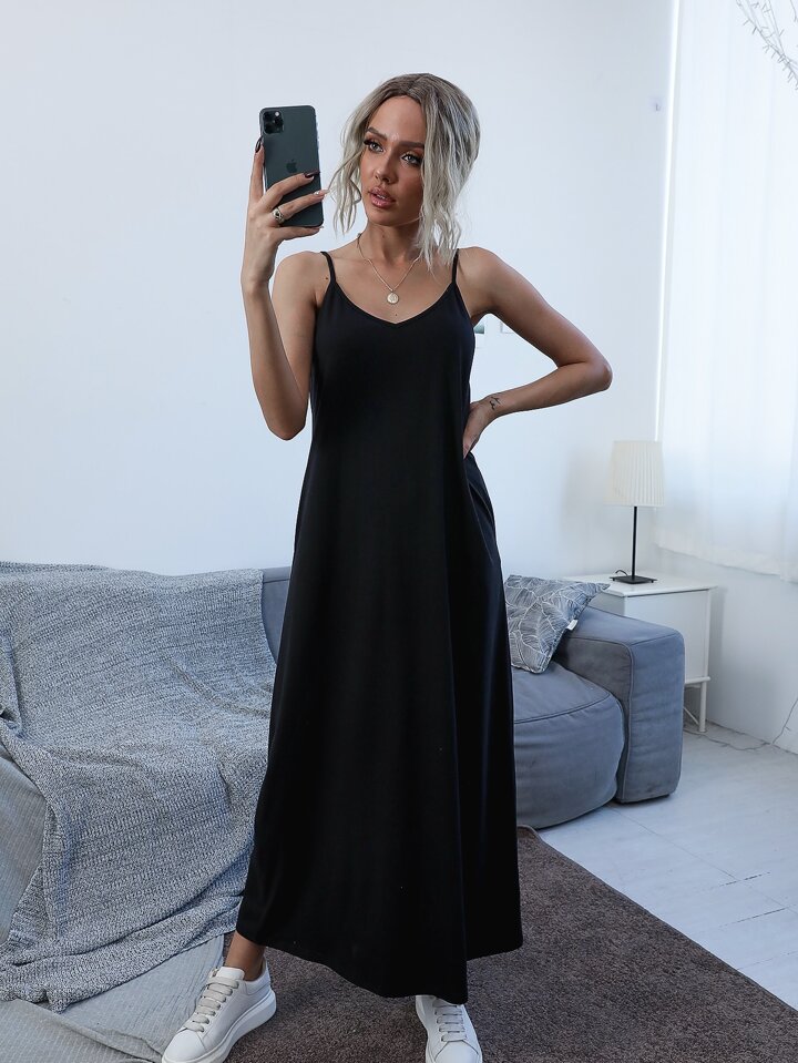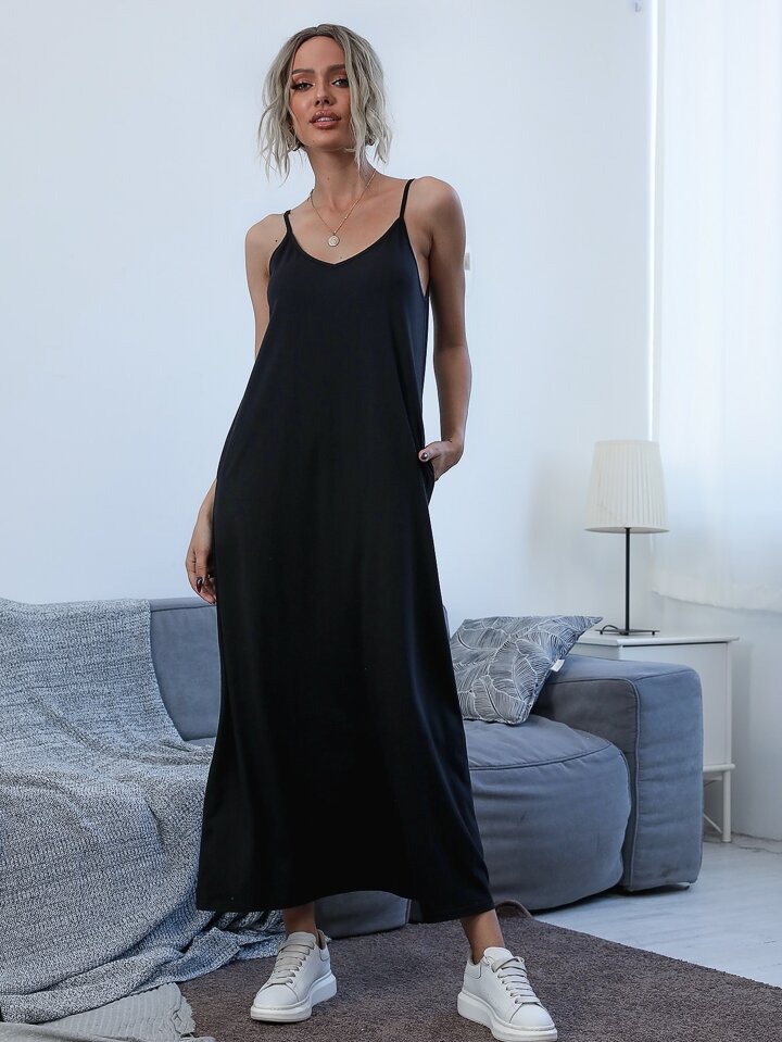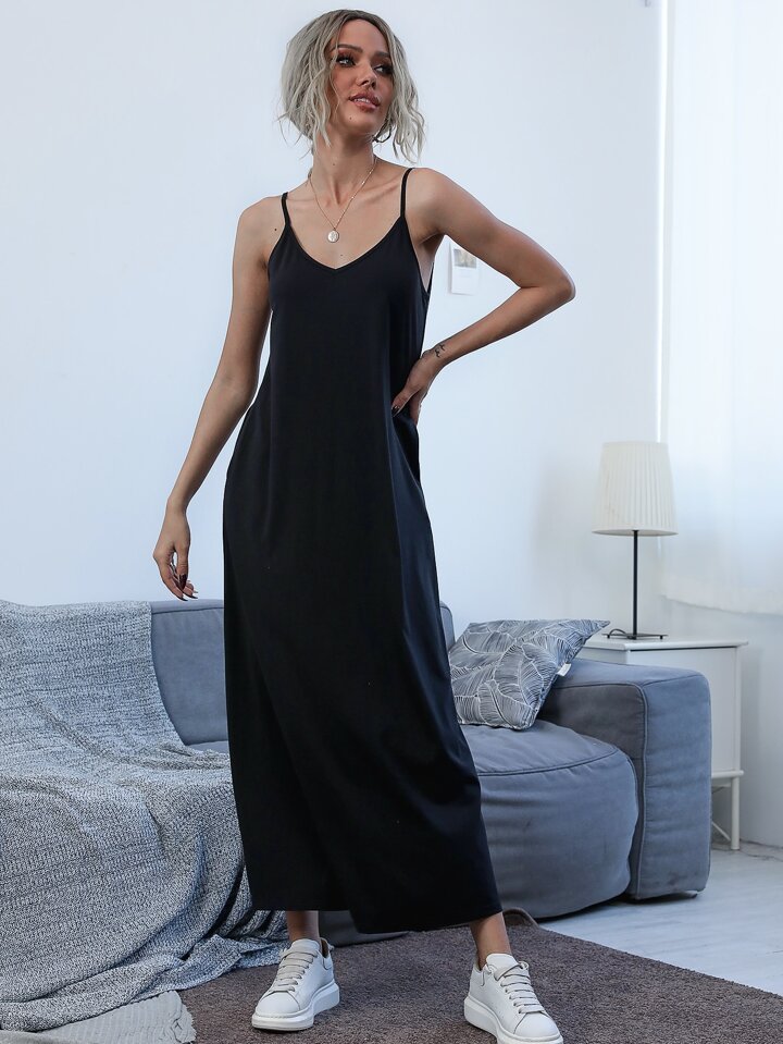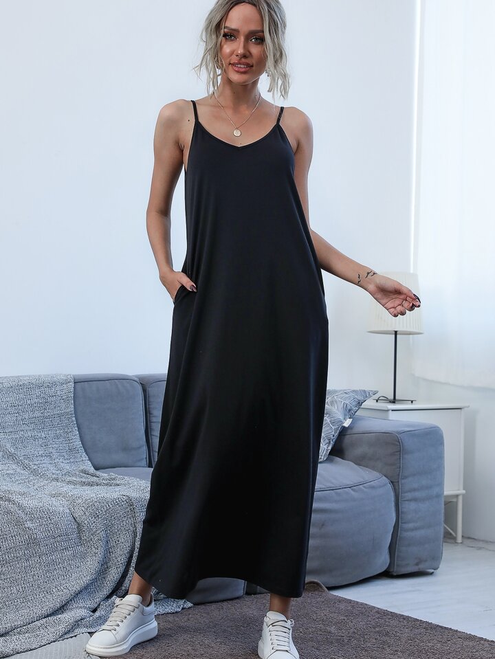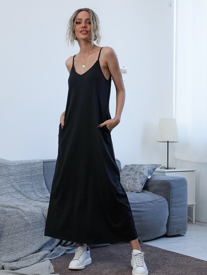 فستان ماكسي للنساء على شكل قميص بجيوب مائلة وقطع واحدة