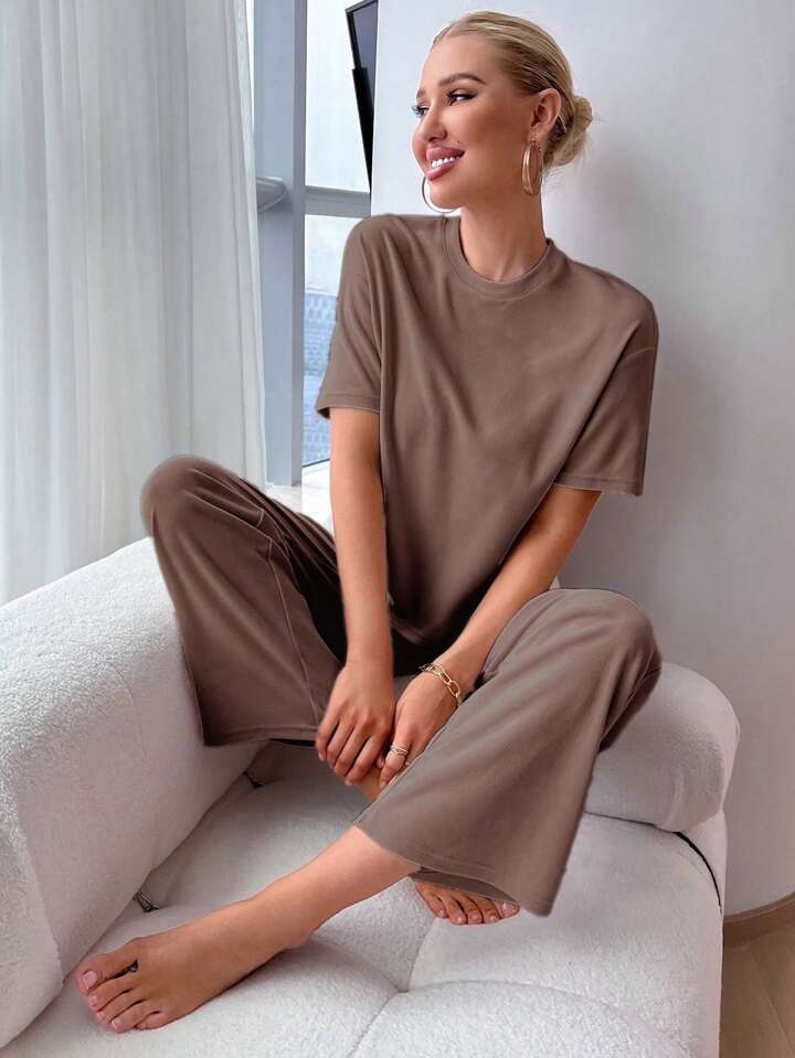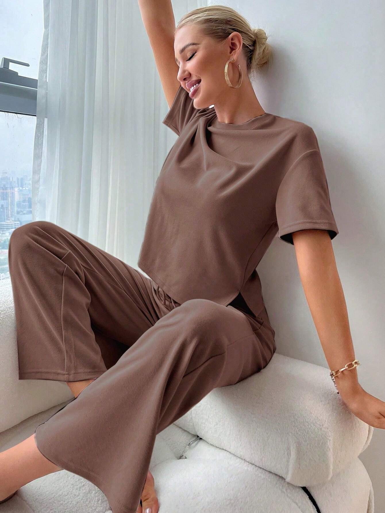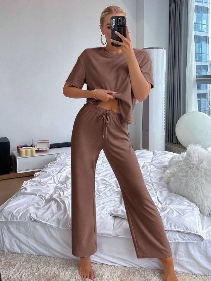طقم بيجامة من ملابس علوية بتصميم شق الذيل وبنطال بخصر ربطة