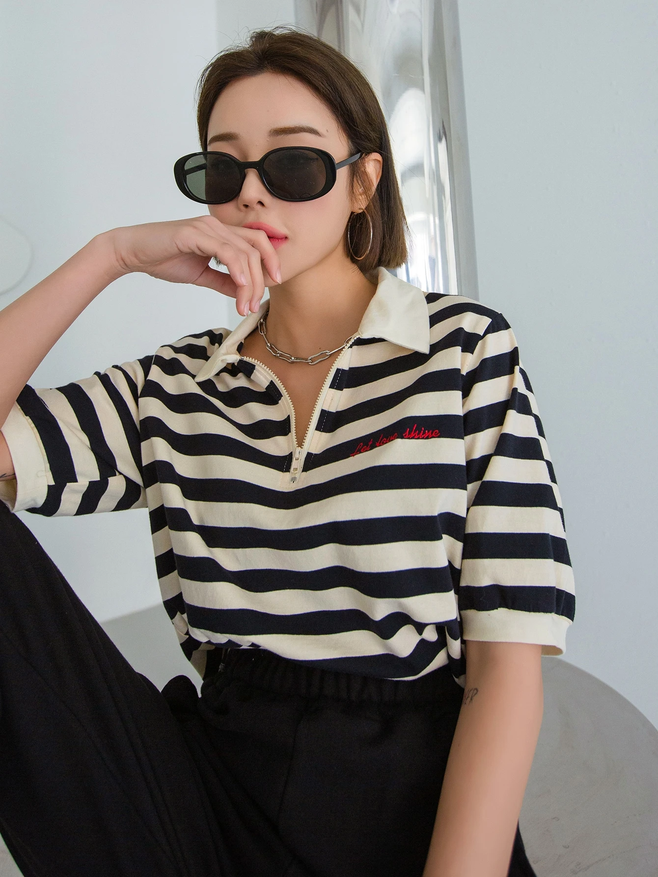 تي شيرت رسمي شريطي على الرقبة مع تطريز شعار وأكمام منتفخة