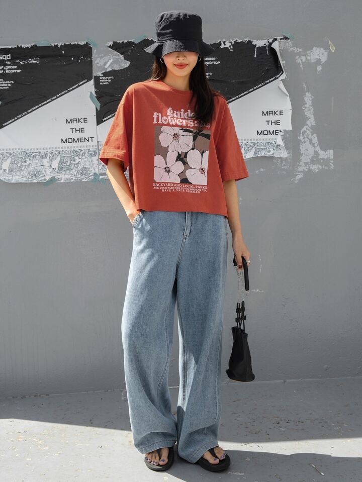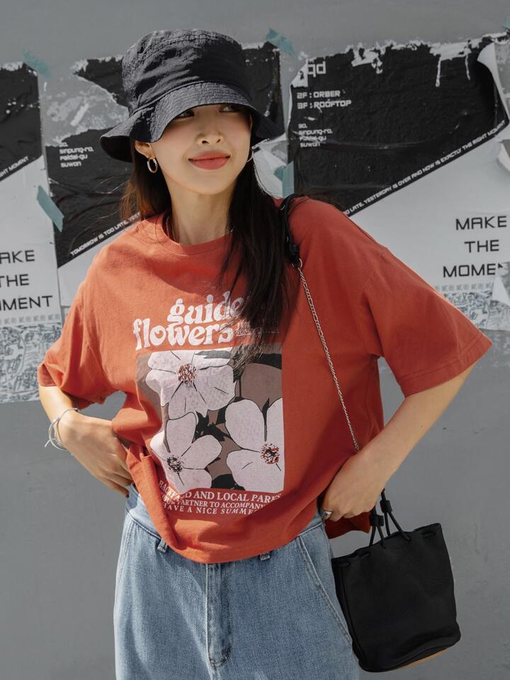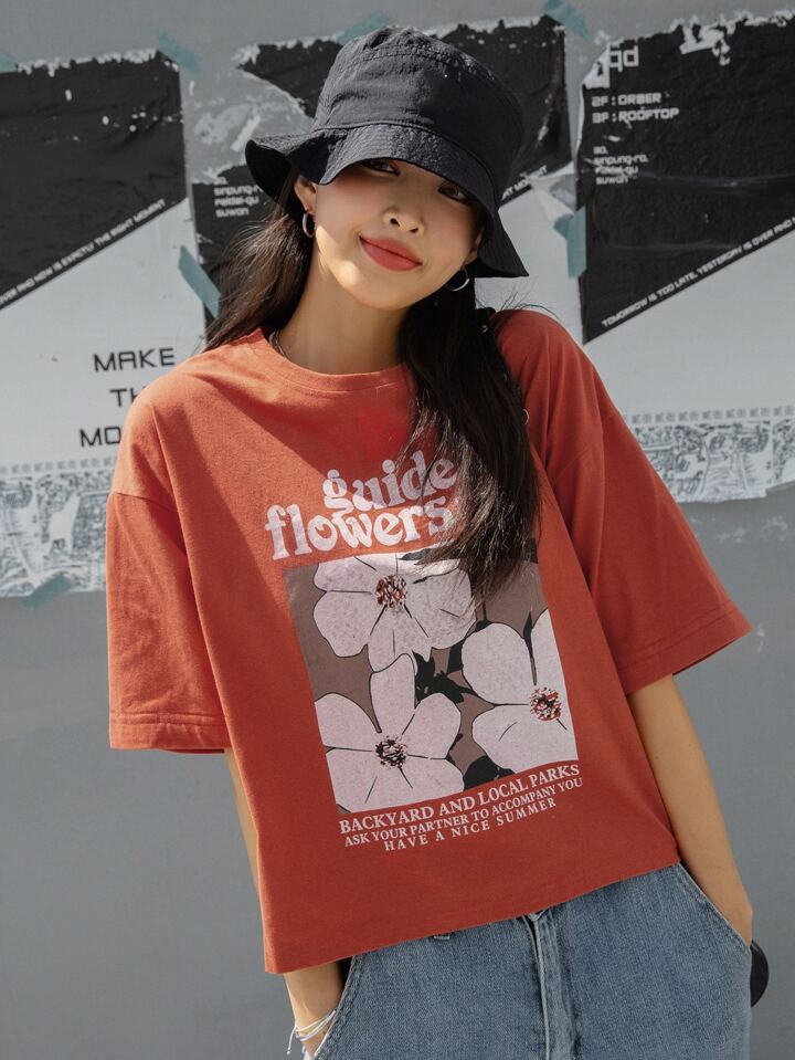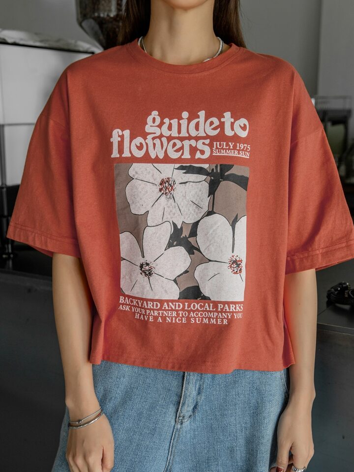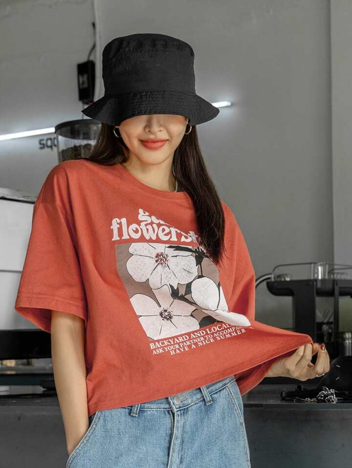 تي شيرت منخفض الاكتاف شعار مع طباعة الأزهار