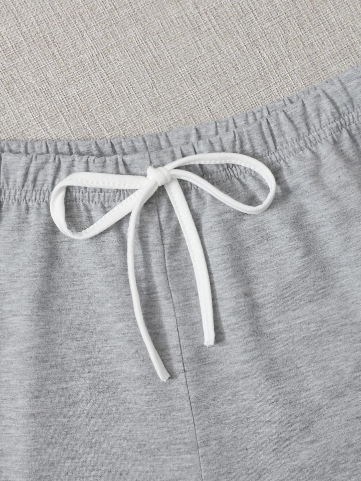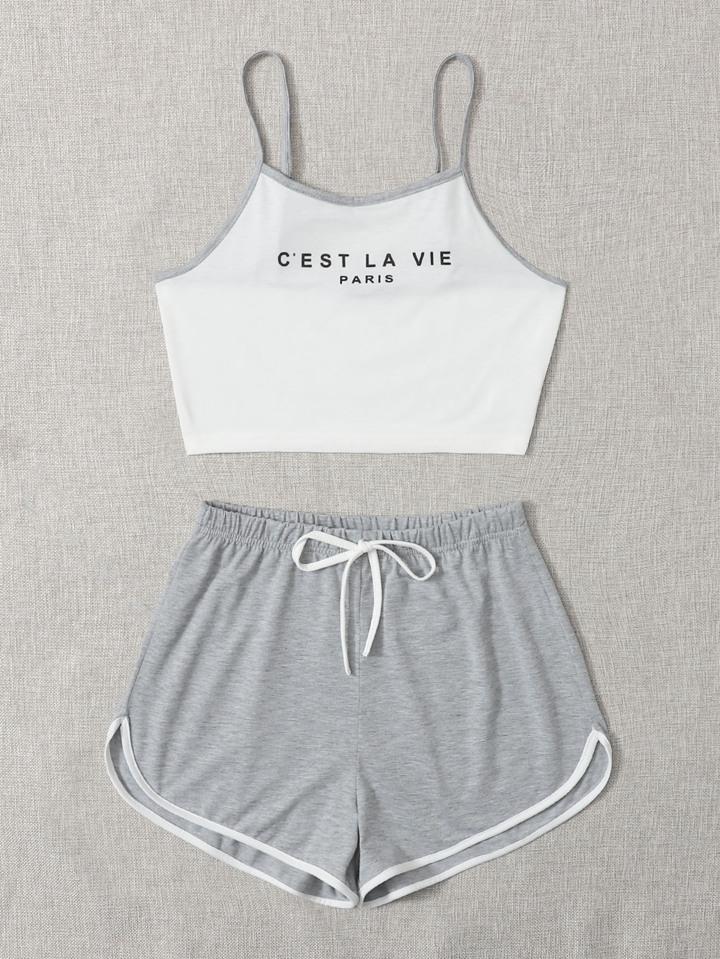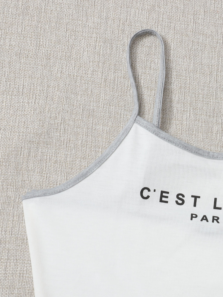 طقم سروال قصير مع لباس علوي بحمالات مقوس متباين بجرافيك شعار