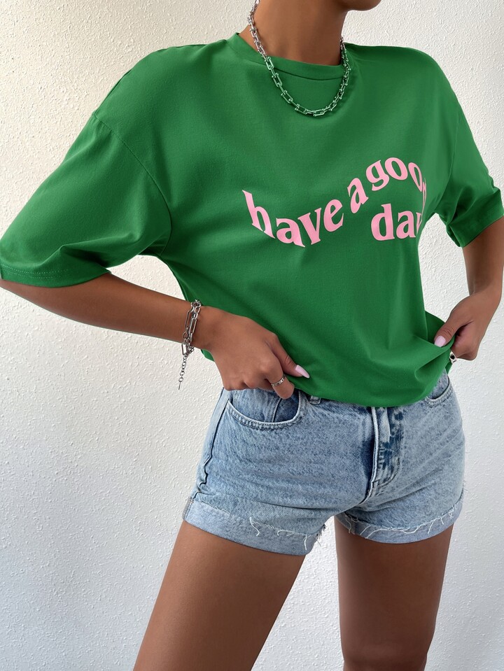 تي شيرت كتف متساقط بطباعة شعار "أنا أمر يومك سعيدا"