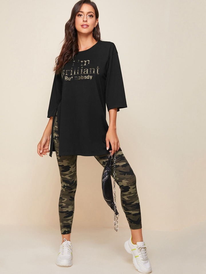 طقم ليقينز مموة مع تي شيرت طويل بشق جانبي جرافيك عبارة