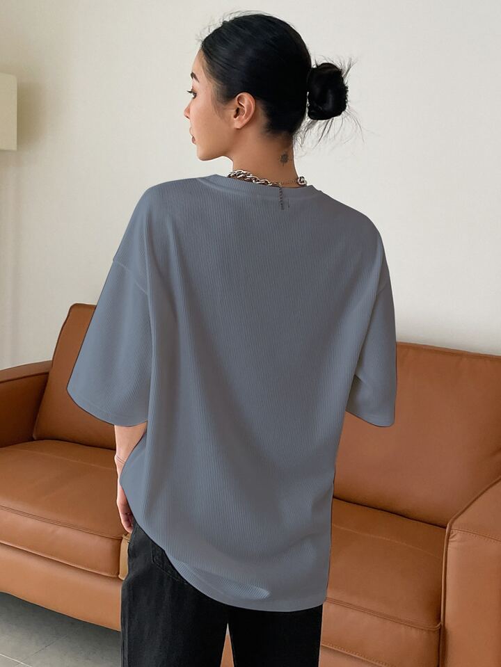 تي شيرت ذو كتف منسدل مع شعار مخيط الاحتفاظ بالهدوء مقاس كبير