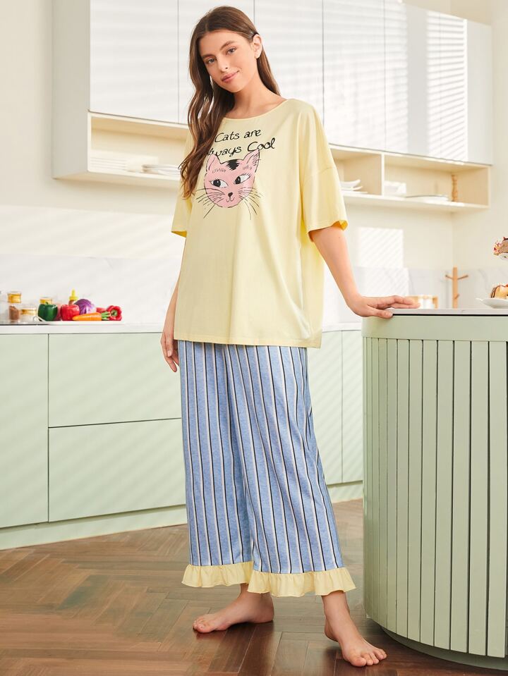 طقم بيجامة توب بطباعة شعار وقطة وبنطلون مخطط